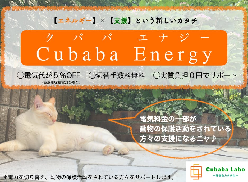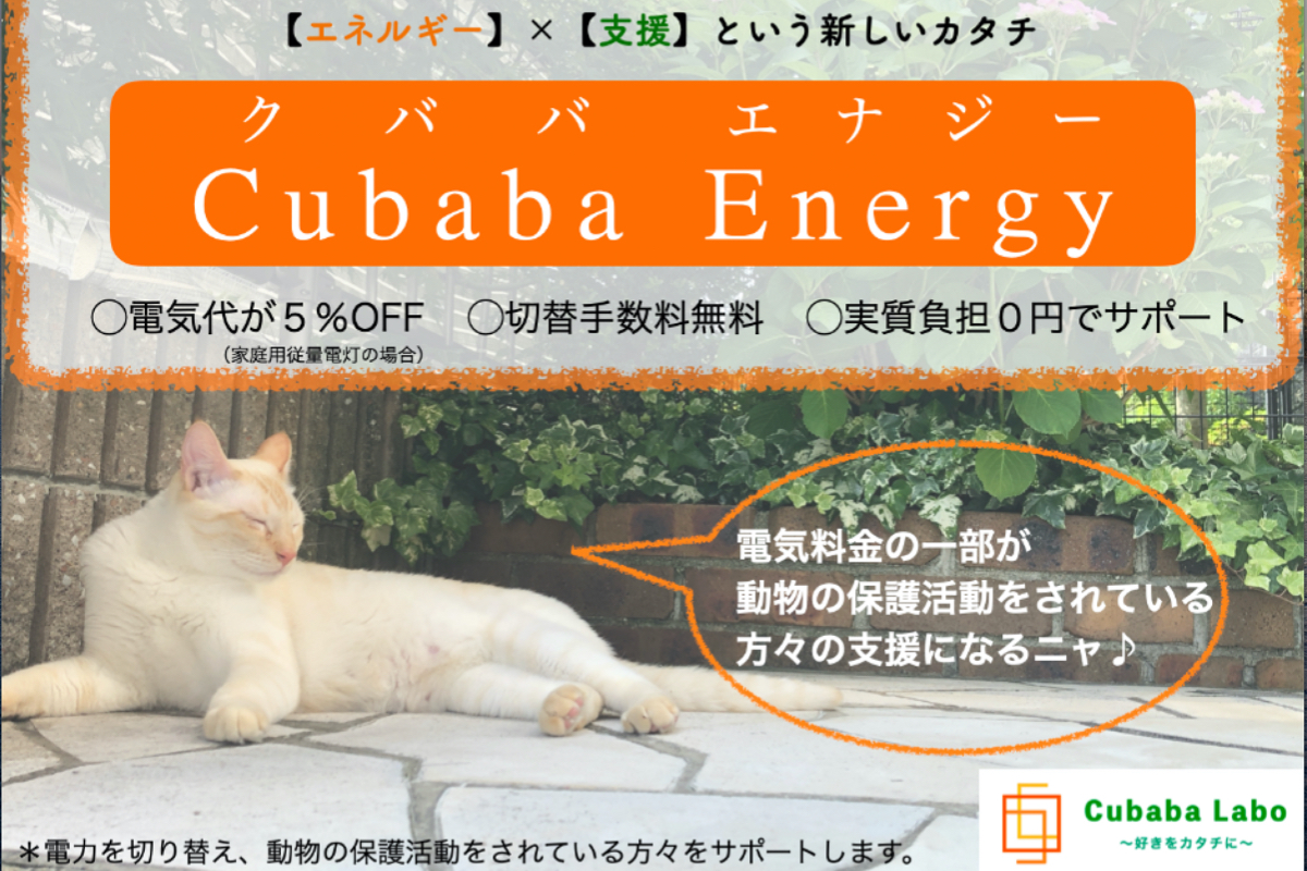 この度【レジェンド電力】様と電力販売代理店という形で提携させていただき、「Cubaba Labo」とコラボした電力ブランドを立ち上げ、保護活動されている方々などへの支援をしようという形になりました。ボランティア活動されている方が電気を『Cubaba Energy』に切り替えると電気代が安くなり売り上げの一部でサポートが受けられるのはもちろん、何か社会貢献をしたいけれど何をどうすればいいのかわからないという方も電気を切り替えるだけで電気代を節約しながら自身の電気使用料で支援もできるので、実質0円で社会貢献できるような形になります!
