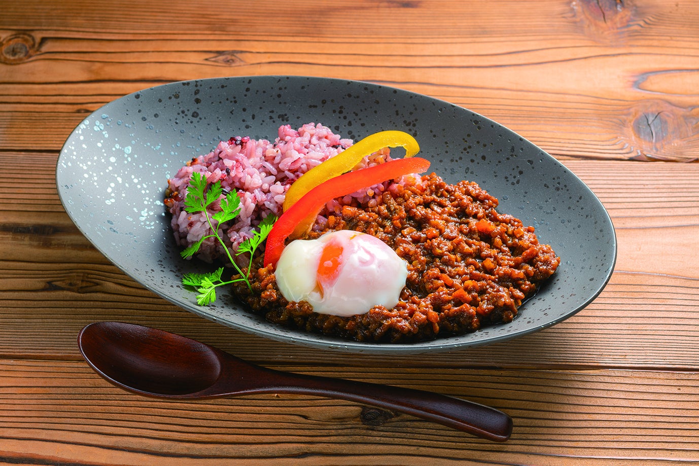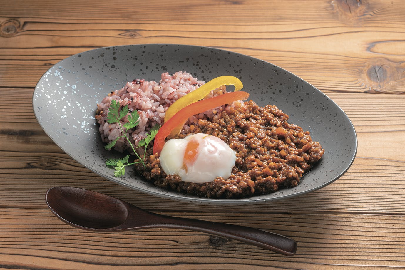 野菜たっぷり「キーマカレー」 玉ねぎ・人参・蓮根・ごぼう・ニンニク入り 22種類の調味料で一度食べたらやみつきになる味わいです! 6種類のトッピングが出来ます