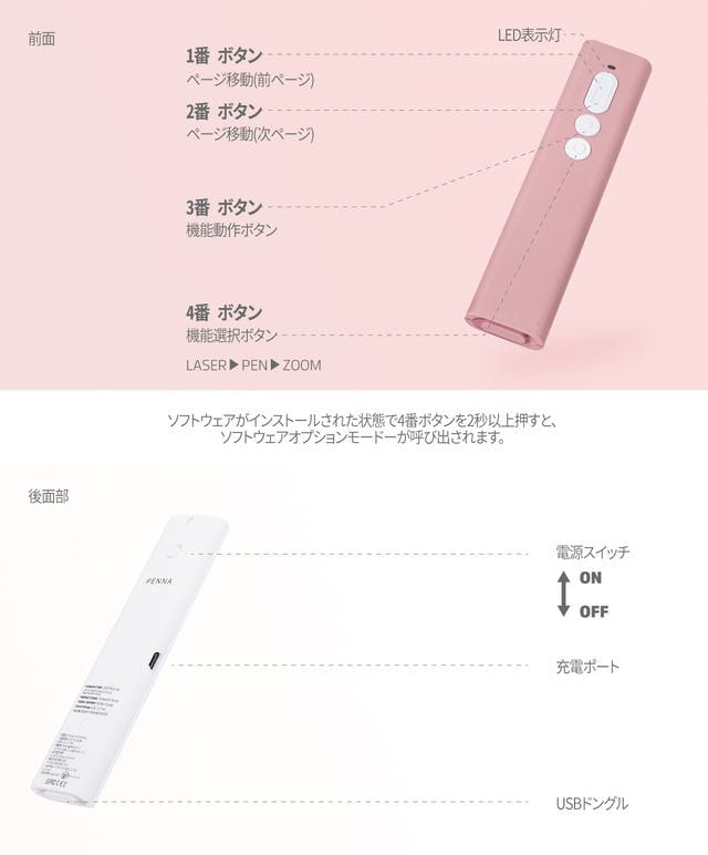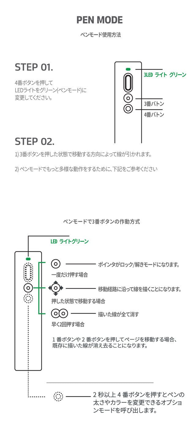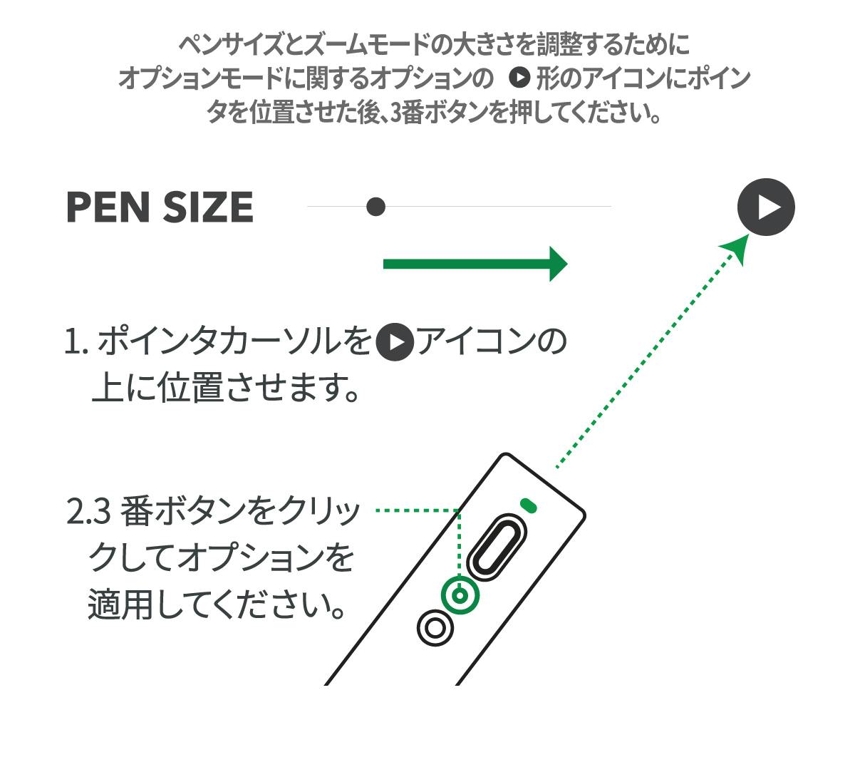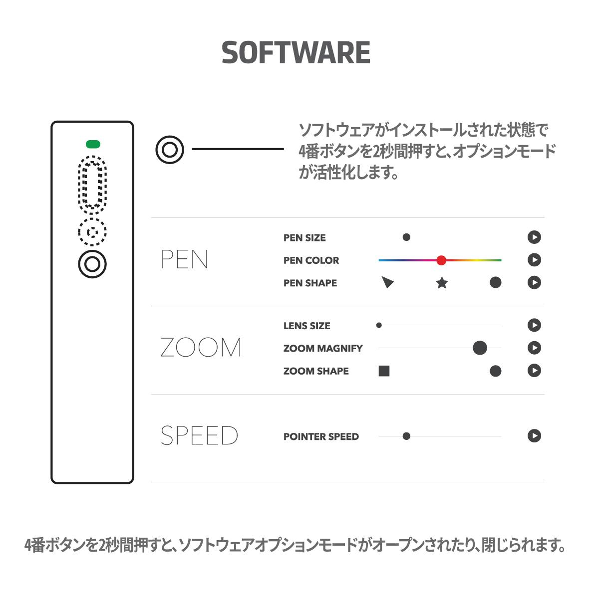 ペナープレゼンターは専用のソフトウェアを通じてペンモード / ズームモードの多様な設定ができます。 ソフトウェアが作動された状態でポインタの4番ボタンを2秒以上押すとオプションモードが呼ばれてポインタースピード/ペンの形/ズームの大きさなどを調整することができます。
