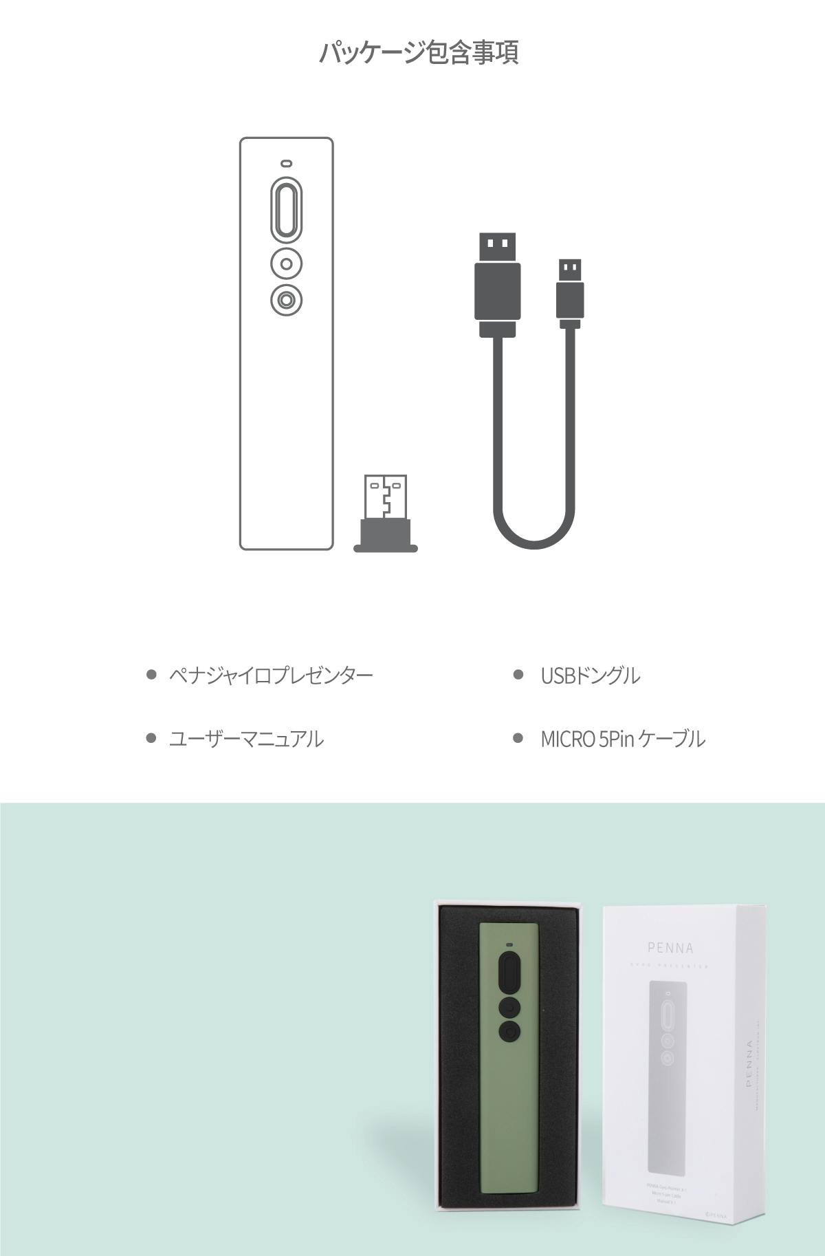 ペナープレゼンターの詳細スペックは下記の通りです。 韓国のKCだけでなく、欧州CE / 米国FCC / 日本JP-MICなどグローバル認証を獲得した製品で、安心してご使用いただけます。