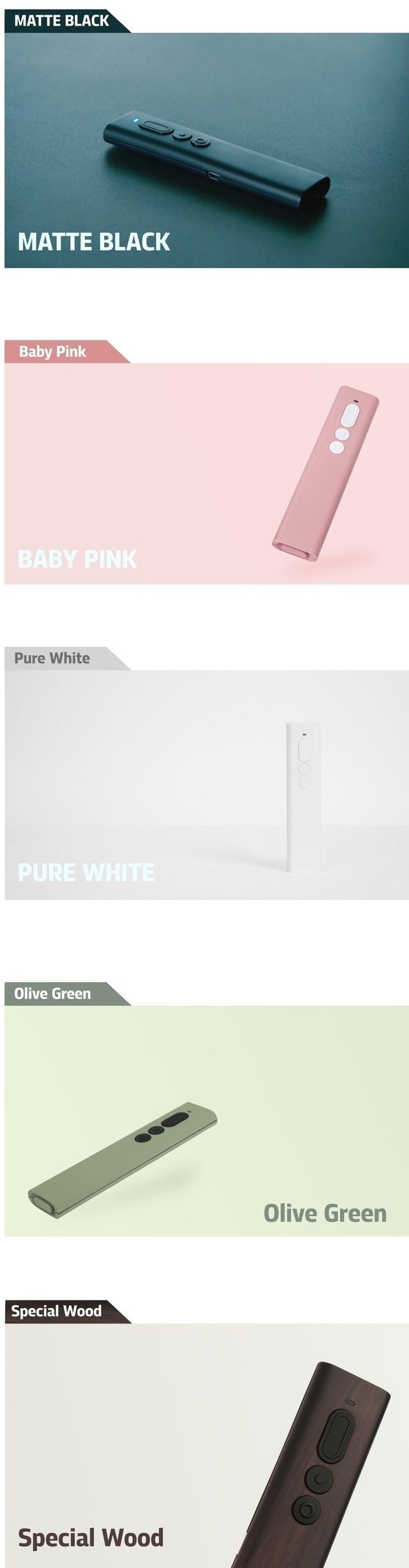 ペナプレゼンターは4つカラーのソリッドモデルとウッドスペシャルモデルで構成されています。 ウッドスペシャルモデルの場合、生産が手作業で進められ、生産量の限界で30台限定数量でご用意できます。 下記のリターン種類をご確認の上、応援購入してください。