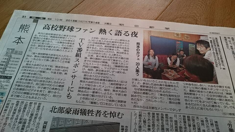 約10年前から、熊本の高校野球好きで年に数回集まり語り合う「熱闘高校野球ナイト」イベントチームを結成。仲間と共に高校野球中継に協賛をしたり、蔦屋書店(熊本三年坂)に依頼いただき高校野球に関する本や雑誌の選書を行いコーナーを設置したりするなど、様々な活動を行なってきました。