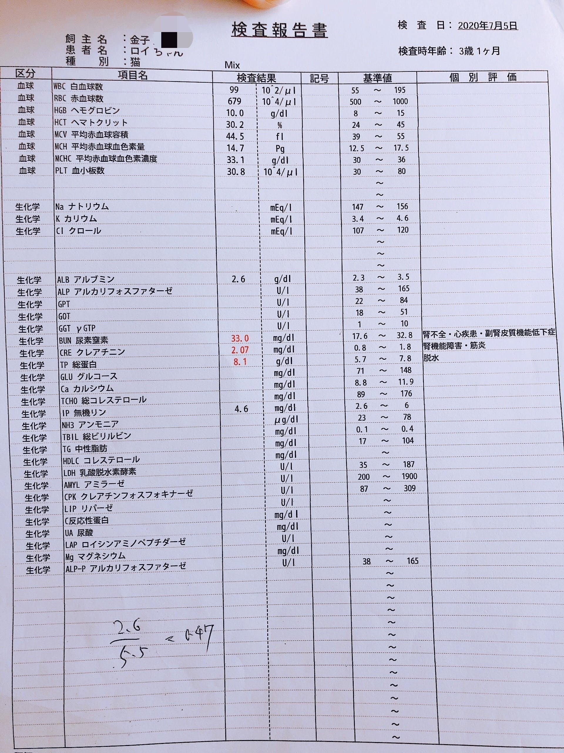 その他の数値ですが、BUN(尿素窒素)が前回より下がりさらに基準値に近づきました。リンも前回同様正常値のままなので体重維持のために腎臓フードを減らした影響は出ていないようです。