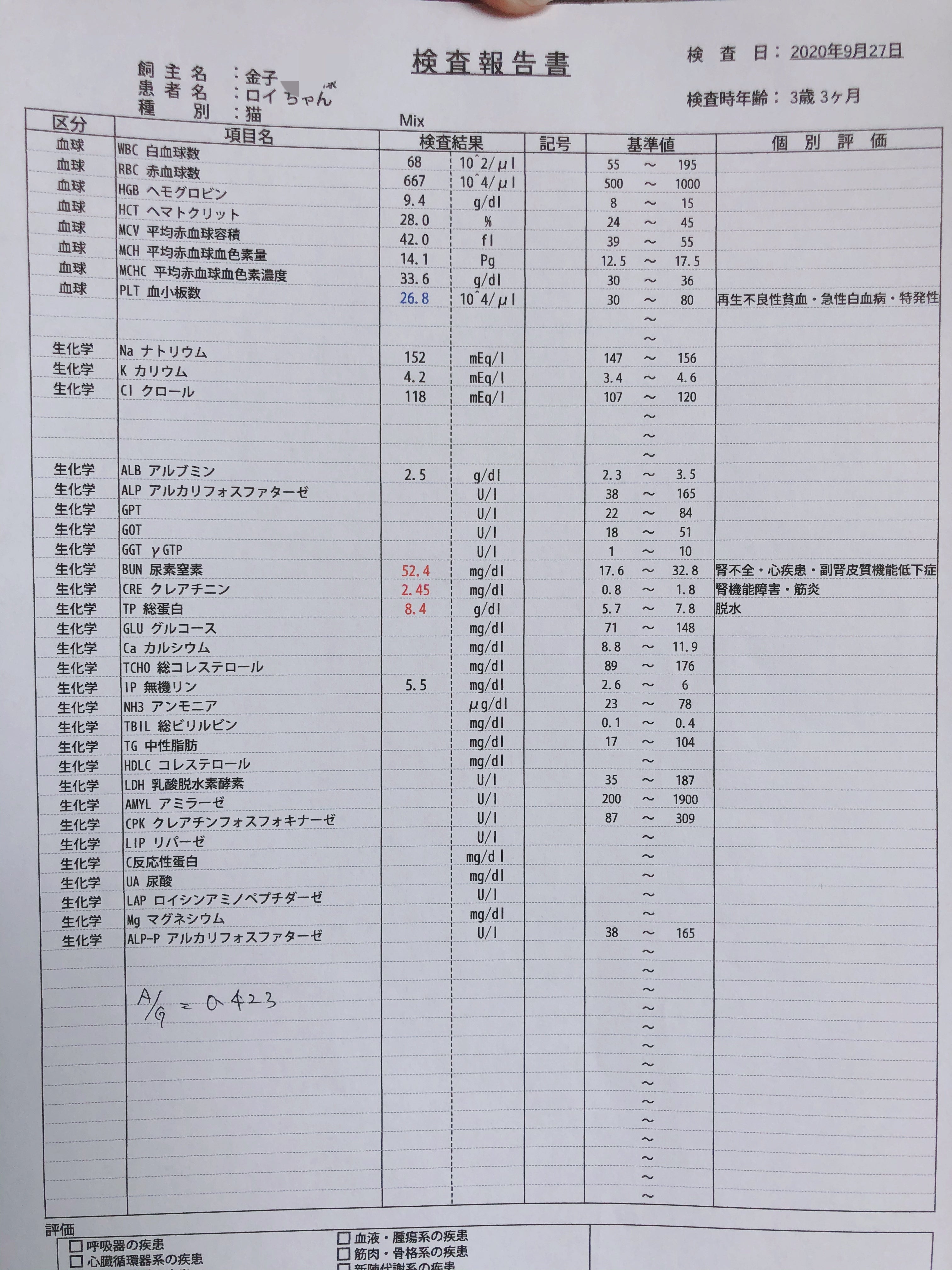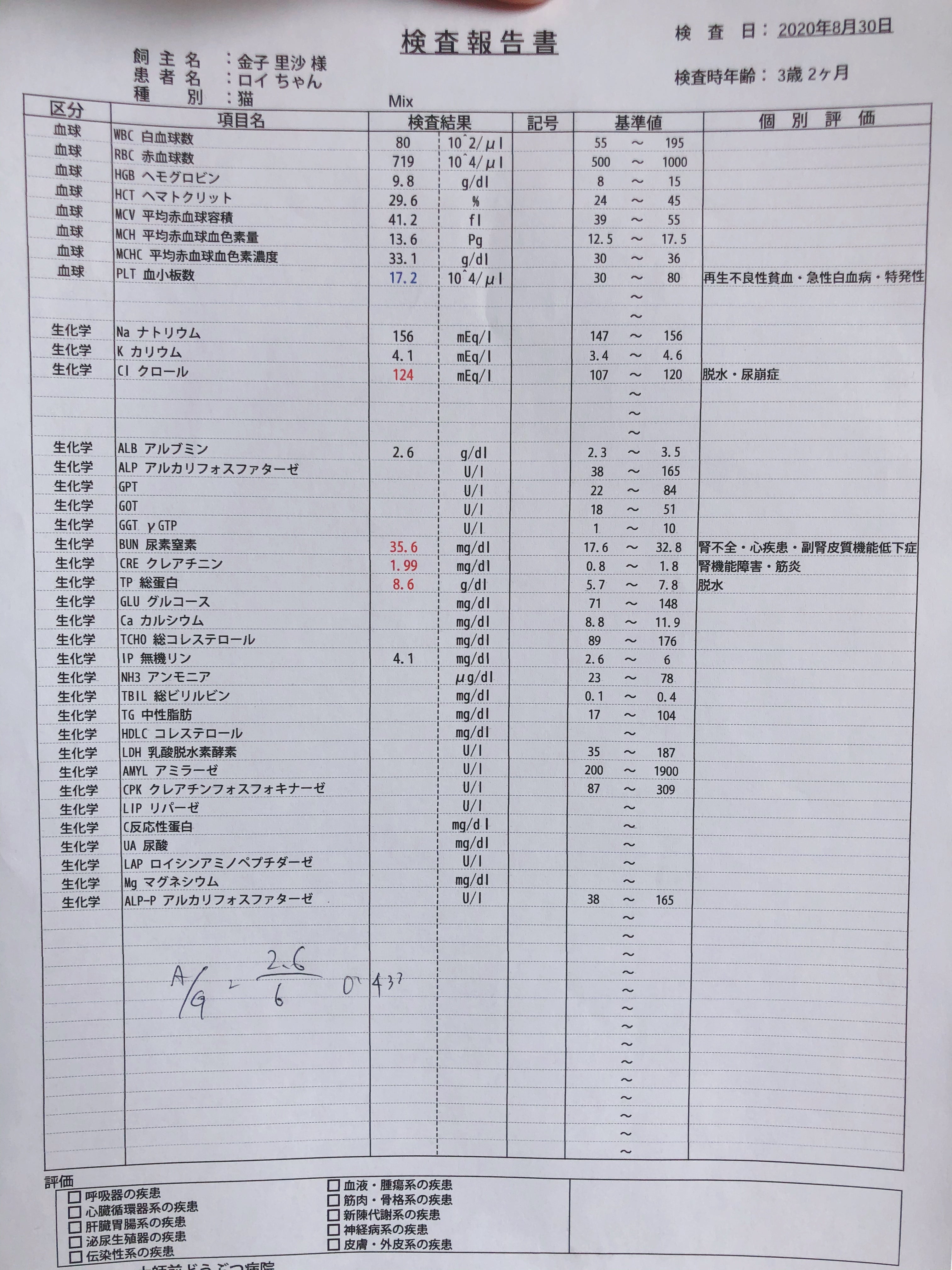 腎数値が4週目の時と比べると今回はだいぶ上がってしまいました。
