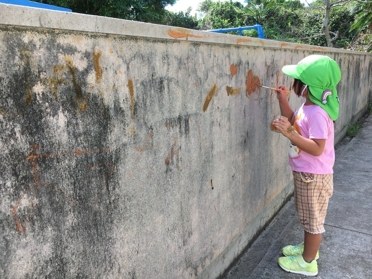 また、今回は外でのワークショップだったので、幼稚園の壁や大きなガジュマルの木にもペイントしていましたよ!(水ですぐ流せるので色残りしません)