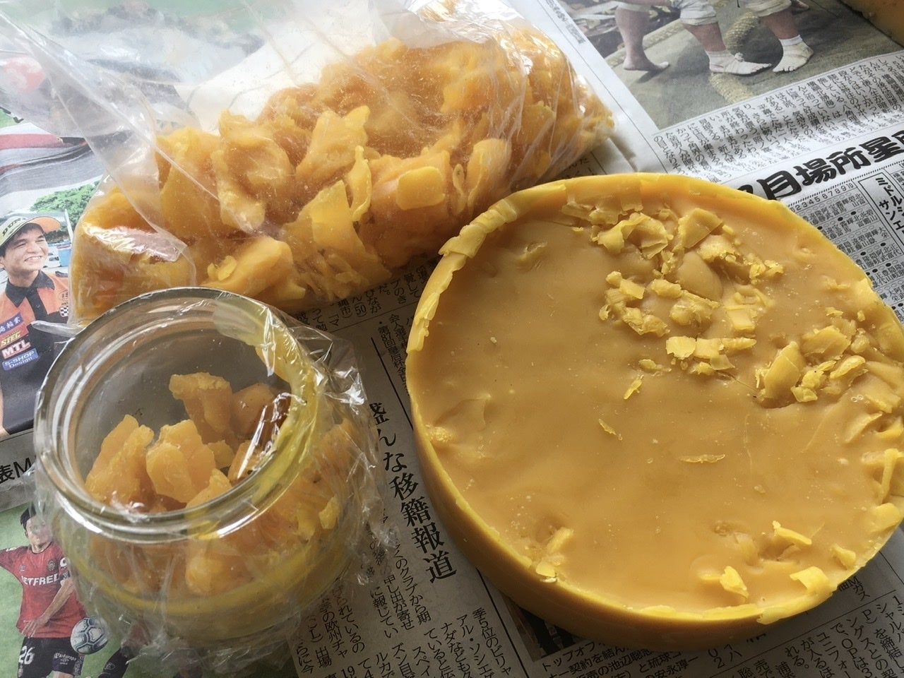 東マンゴー園ではマンゴーを受粉させるためにミツバチをハウスの中に入れています。そのミツバチたちが蜂蜜を作り、蜂蜜を絞った後の巣が蜜蝋として残るのです。そしてそれを精製して《えらぶ色クレヨン》や【ジャガイモねんど】ができるのです。