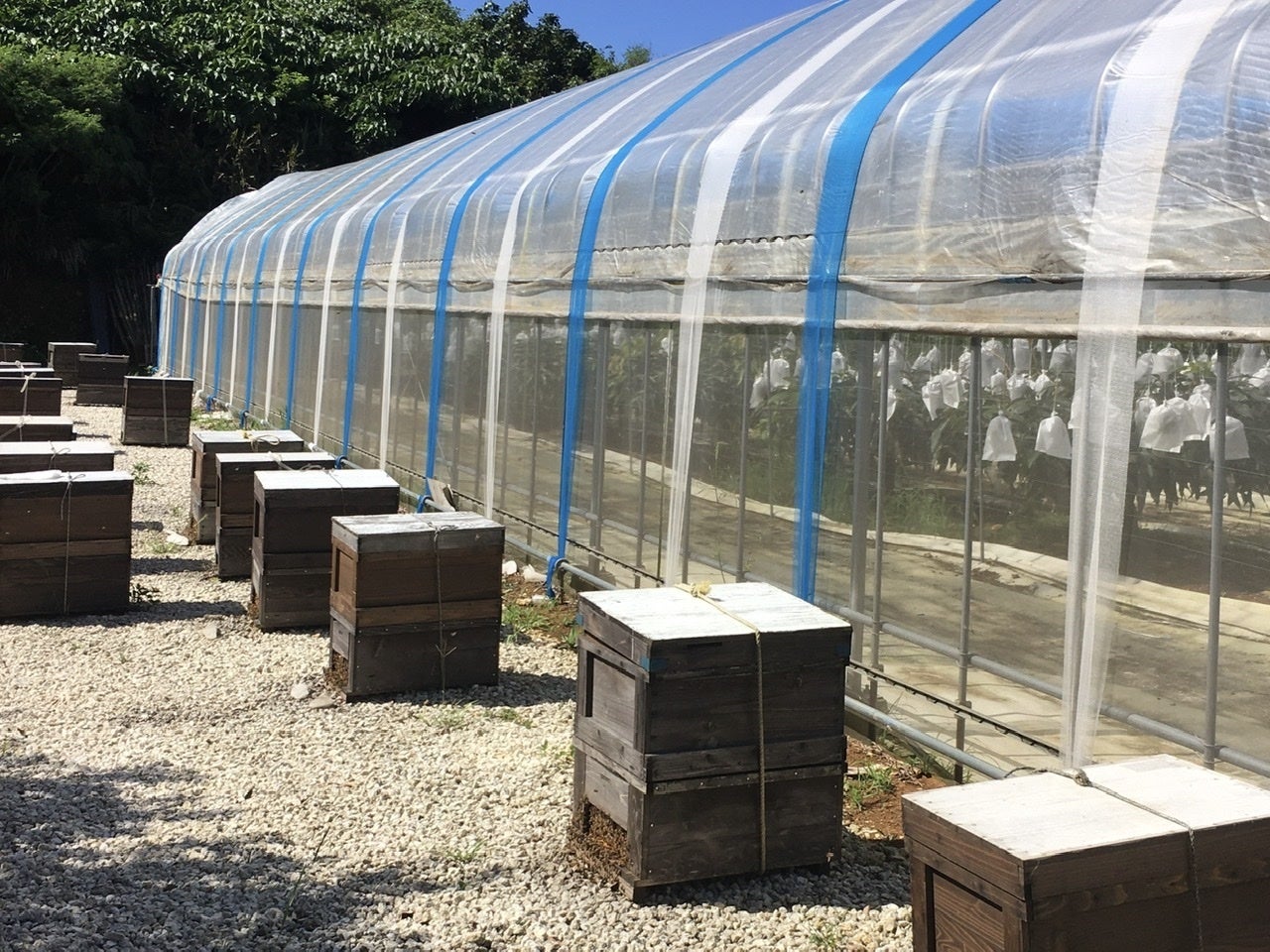 マンゴーのハウス脇に置かれたミツバチの巣箱
