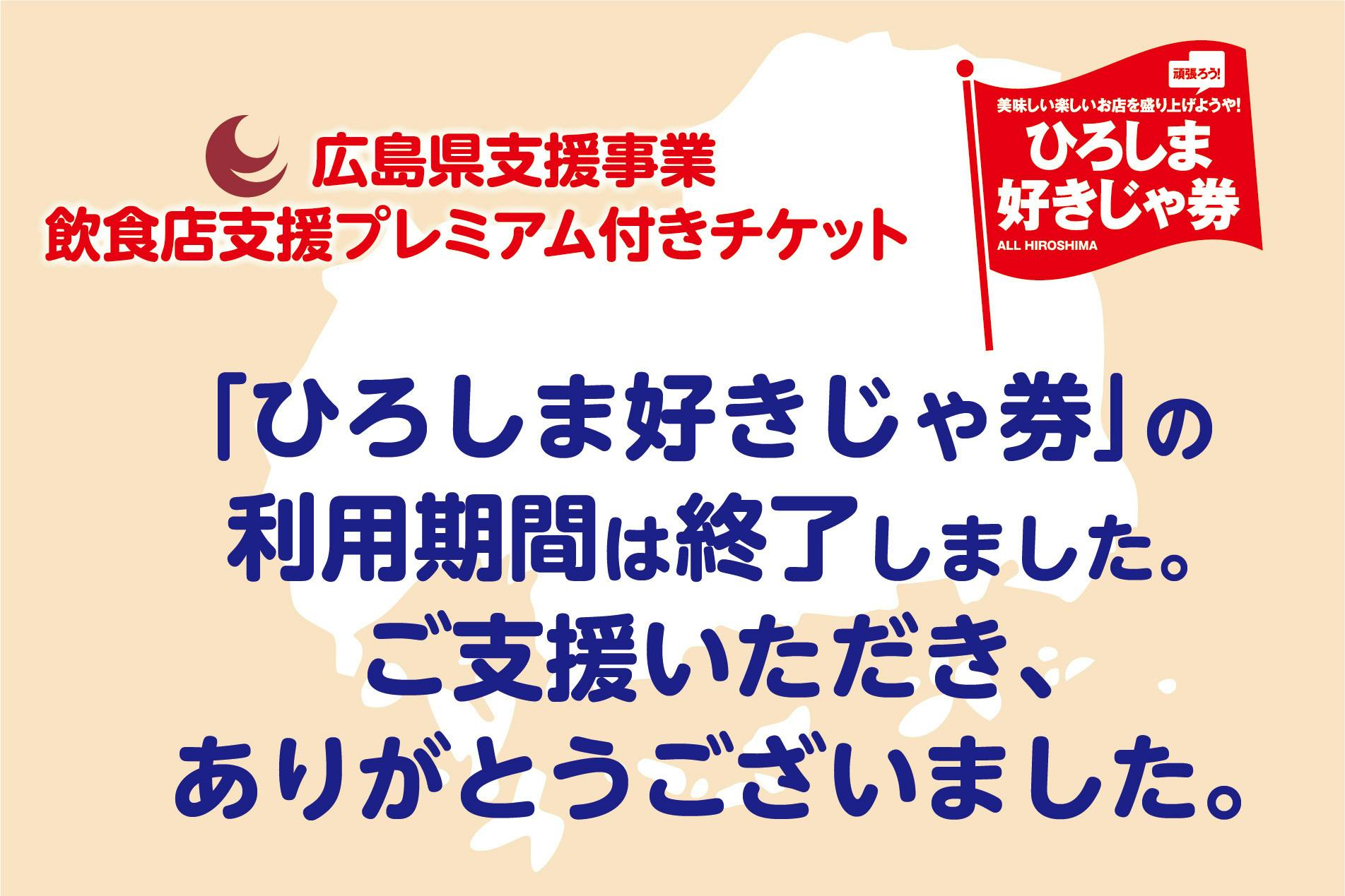 「ひろしま好きじゃ券」にご支援いただきました皆様、誠にありがとうございました。有効期間を延長しておりました「ひろしま好きじゃ券」ですが、 ご利用できる期間は終了いたしました。今後も飲食店をご利用の際には、新型コロナウイルス感染対策に留意の上、ご飲食をお楽しみいただきますよう、よろしくお願い致します。