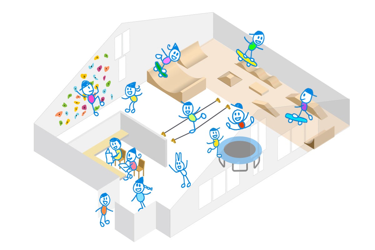 自習スペースが併設されたスケートボード・ボルダリング・スラックライン・トランポリンが楽しめる、子供たちが放課後に安心して遊べる屋内施設を作ります。