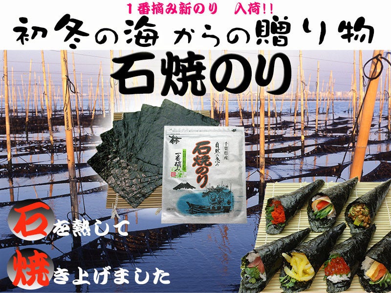 干満差の大きい江戸前(東京湾)の干潟で摘まれた海苔は、磯の香り良い旨みのある海苔です。この一番摘みの乾海苔を石焼のり釜機で焼き上げた昔ながらの天日干しの旨みを再現した焼のりです!ステイホームのこの時期、太巻き祭り寿司や楽しいおにぎらずづくりを家庭でチャレンジ!