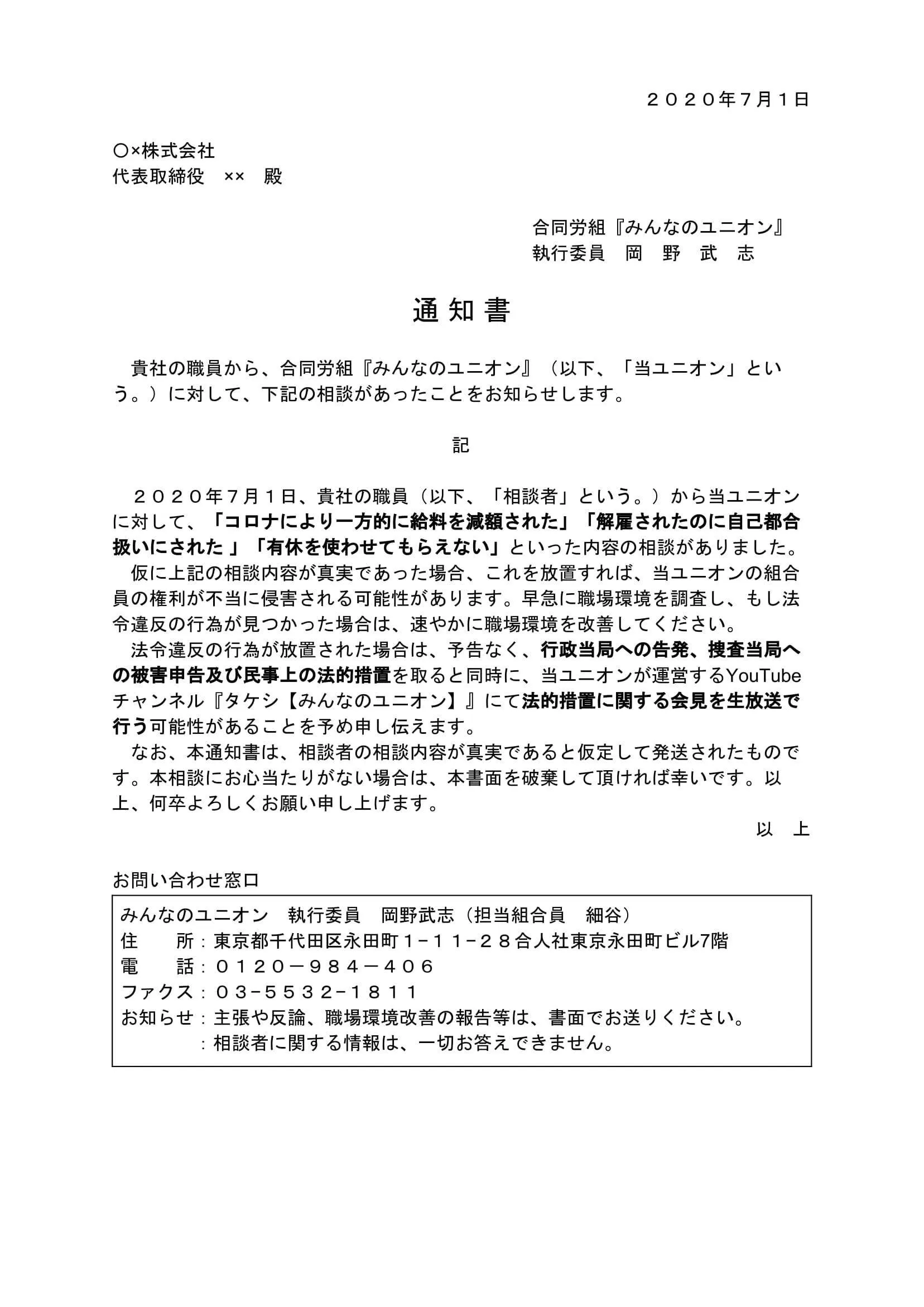・組合員に代わり、会社に職場改善を要求する通知をユニオン名義で送る