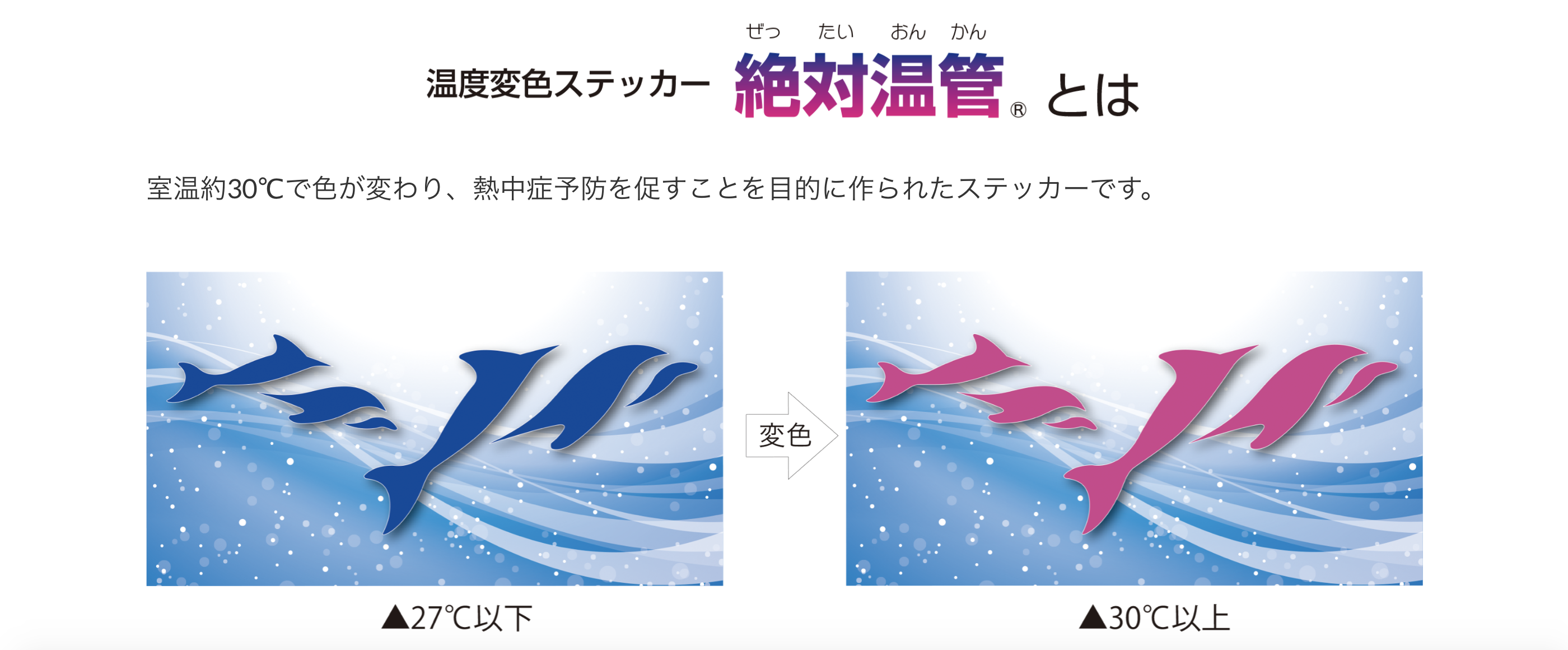 室温約30℃でブルーのイルカがピンクに変わり、室温の上昇をお知らせします。