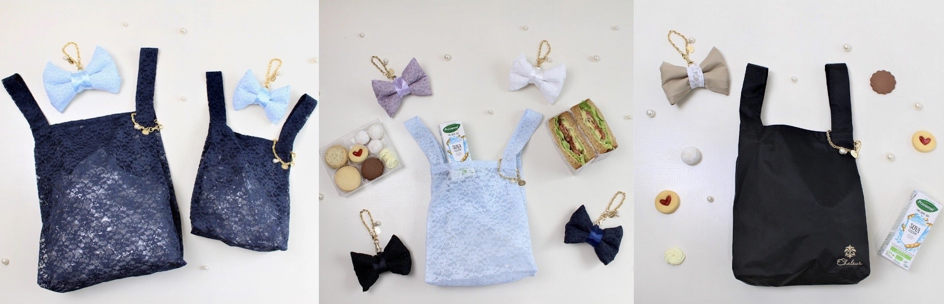 シャルールのエコバッグは、エレガントなレース素材とシンプルな抗菌素材「バイオライナー」でお作りする2種類。使わない時は、リボン型のバッグチャームになります。