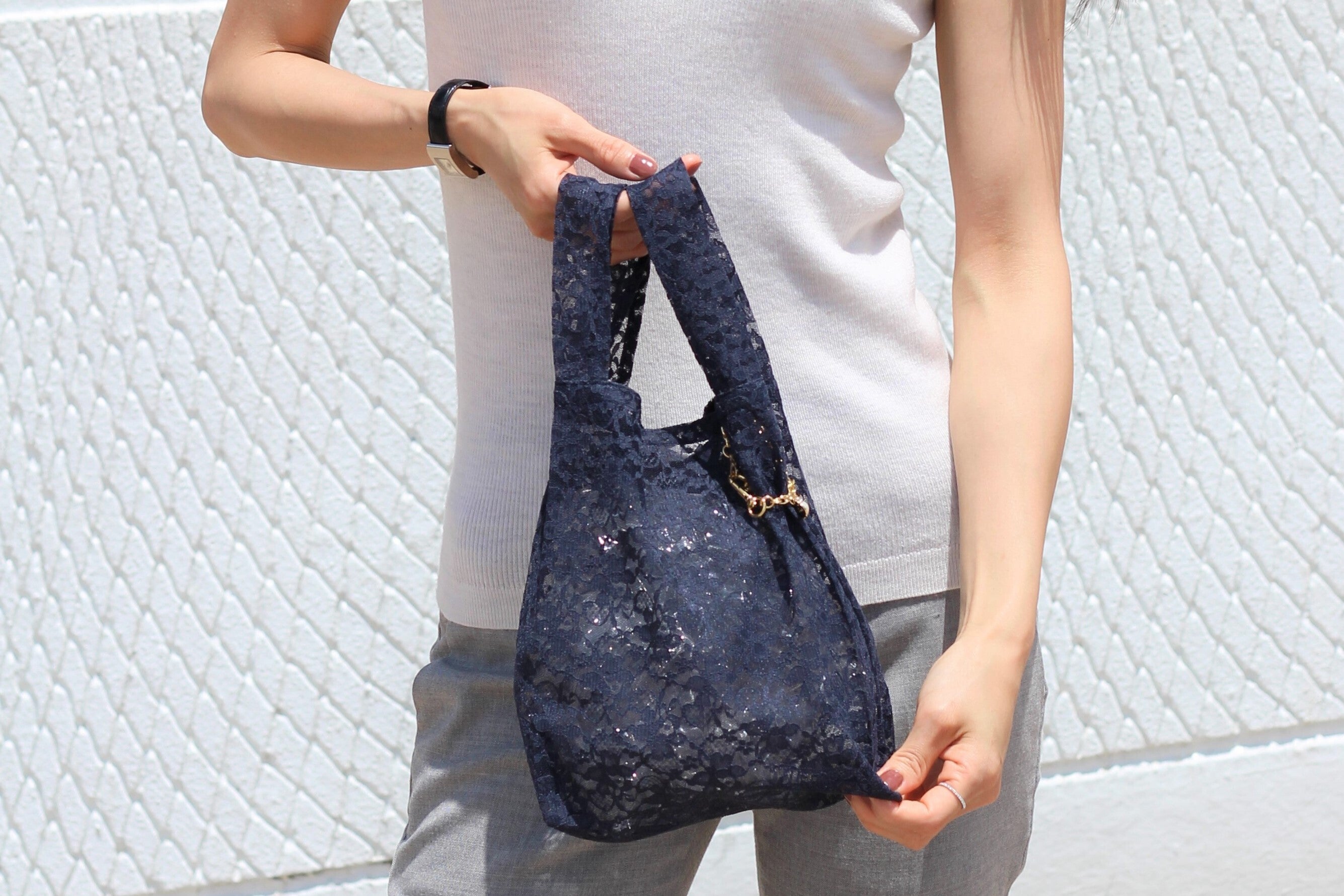 これまでのエコバッグにはないエレガントな雰囲気を、フラワーモチーフが華やかなレース素材で演出しました。Sサイズはランチバッグにもぴったりのサイズです。抗菌タイプもしっかり感のある生地にこだわり、生活感レスに。しわになりにくく、ひっかかりにくい目の細かいラッセルレースを使用するなど、機能性にもこだわりました。