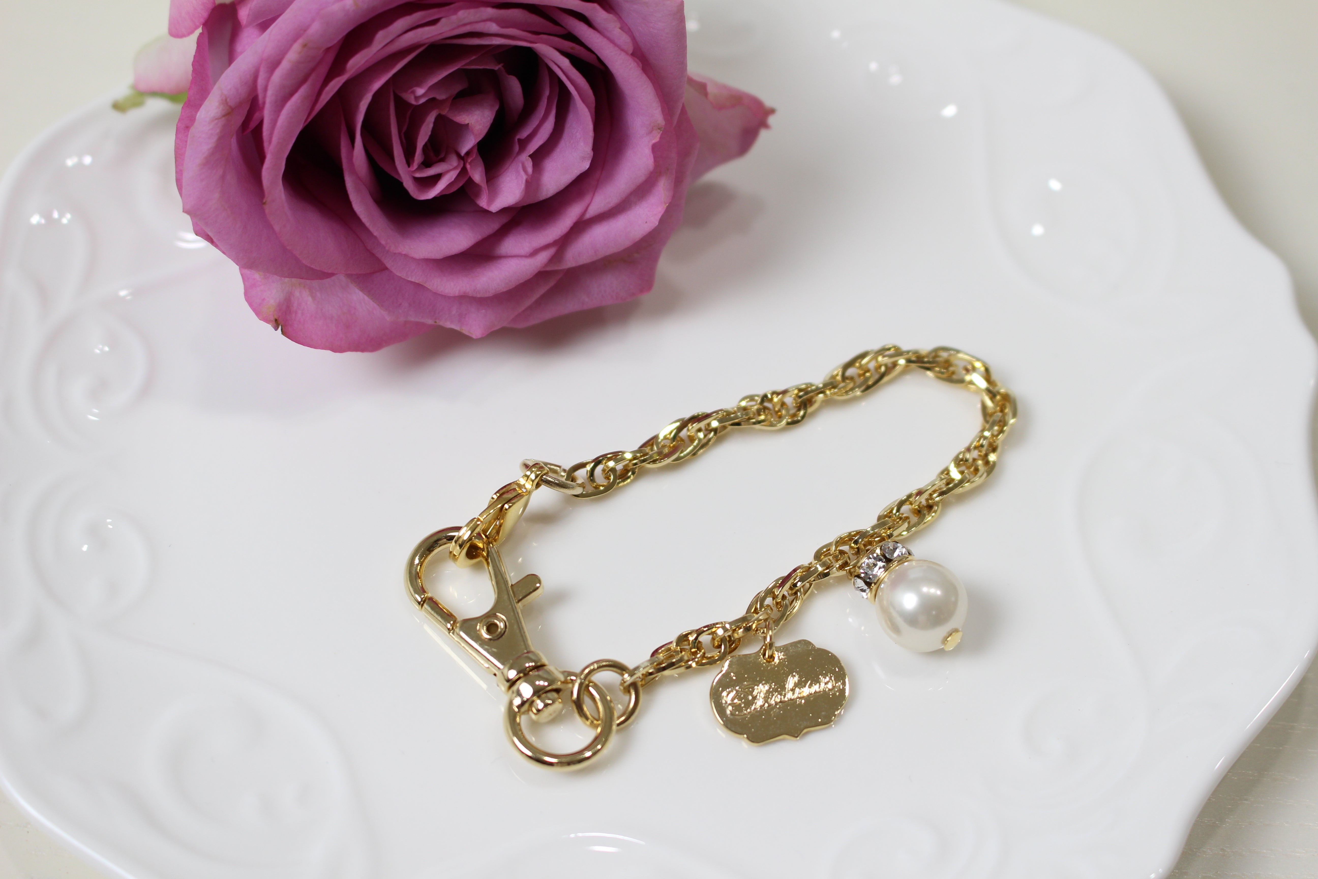 ◆チェーンに付いている、スワロフスキーとパールやブランドチャームがかわいい!細部にまで作り手のこだわりを感じます。