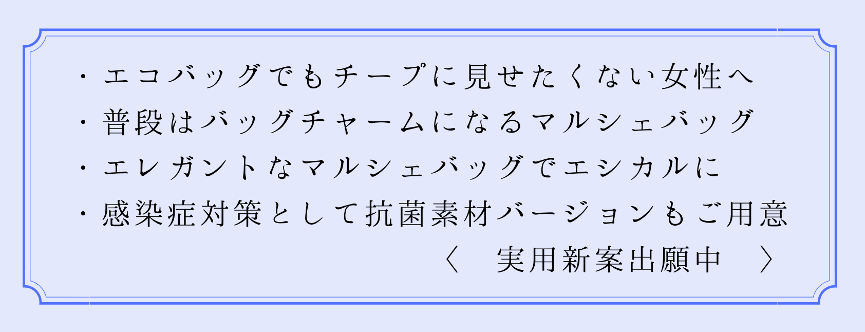 誰もがエコバッグを持つ時代、どんなときもどんな場所でも女性を品よく見せられるエコバッグをつくりたい。「エコバッグ」とは呼びたくないくらい上品な「マルシェバッグ」をたくさんの方にお届けして、お買い物のときくらい気分を上げてもらいたい。