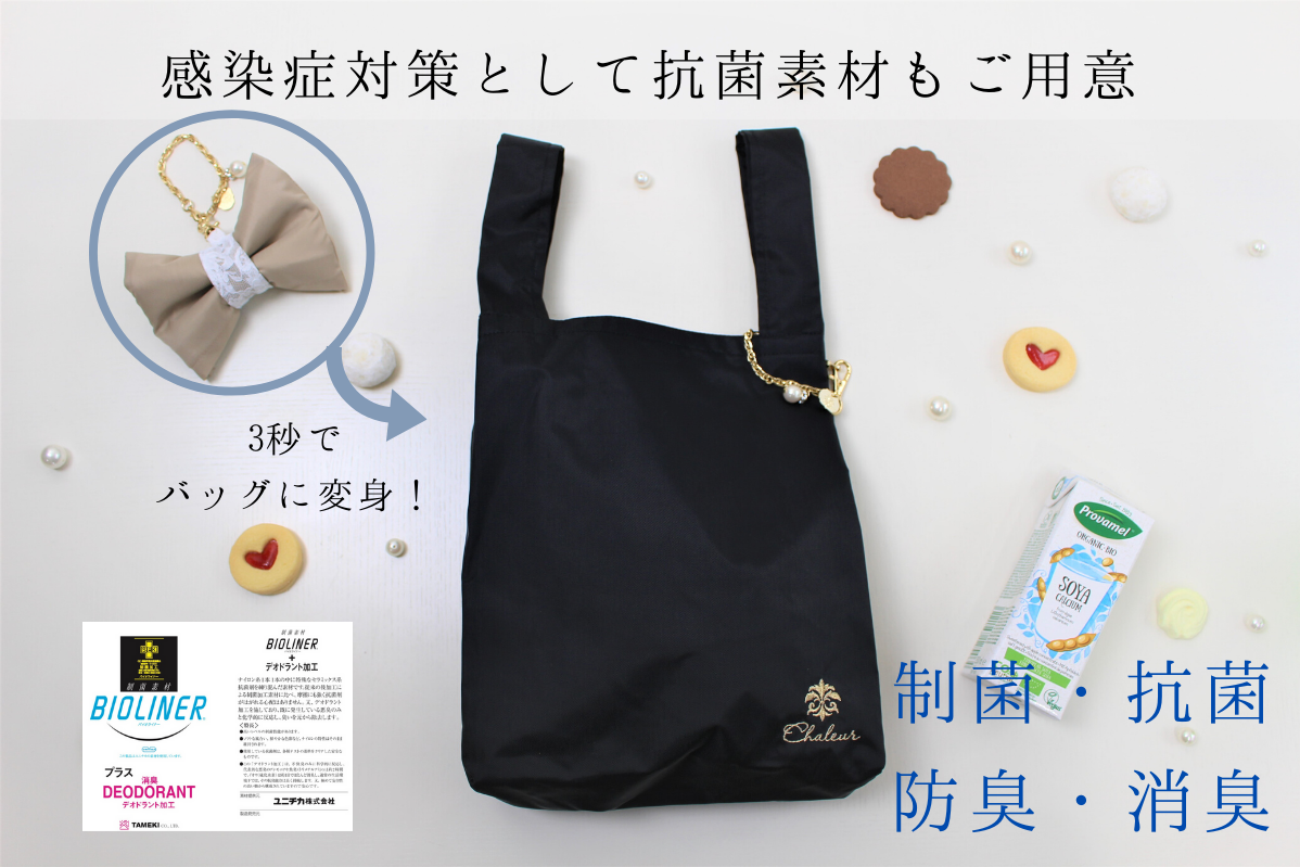 シャルールでは、よりエレガントなレース素材の他に、抗菌素材「バイオライナー」を使ったマルシェバッグもご用意しました。