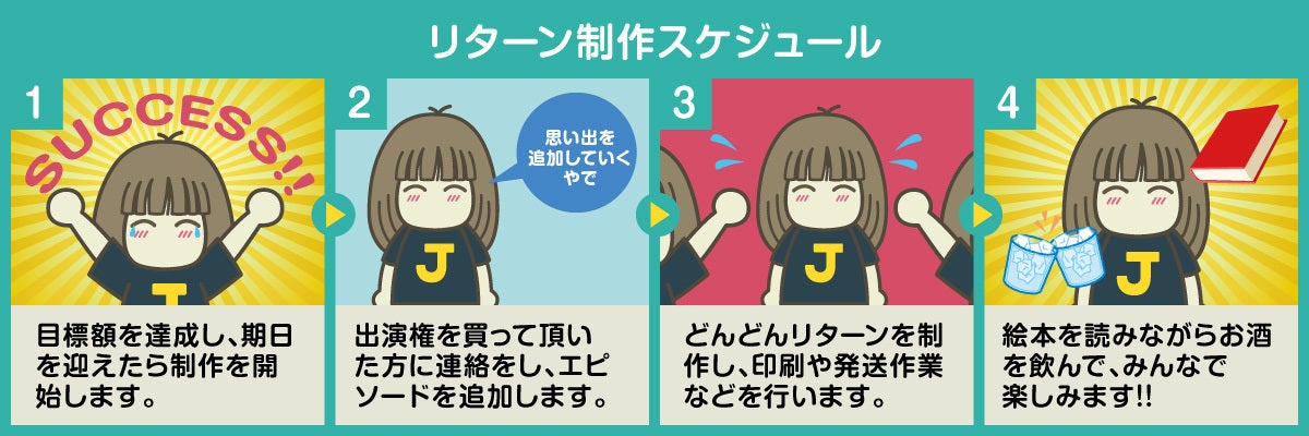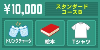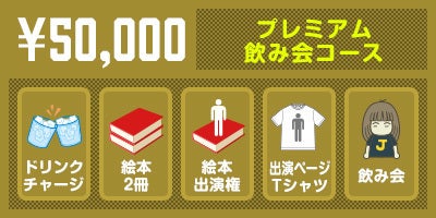 じゅんじゅんがお礼の飲み会を開き、完成した絵本2冊と出演シーンのTシャツを手に入れることができるコースです。