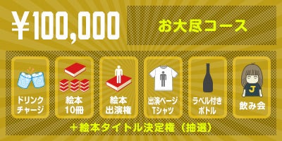 じゅんじゅんがお礼の飲み会を開き、完成した絵本10冊と出演シーンのTシャツ、ラベル付きのボトルを手に入れることができるコースです。
