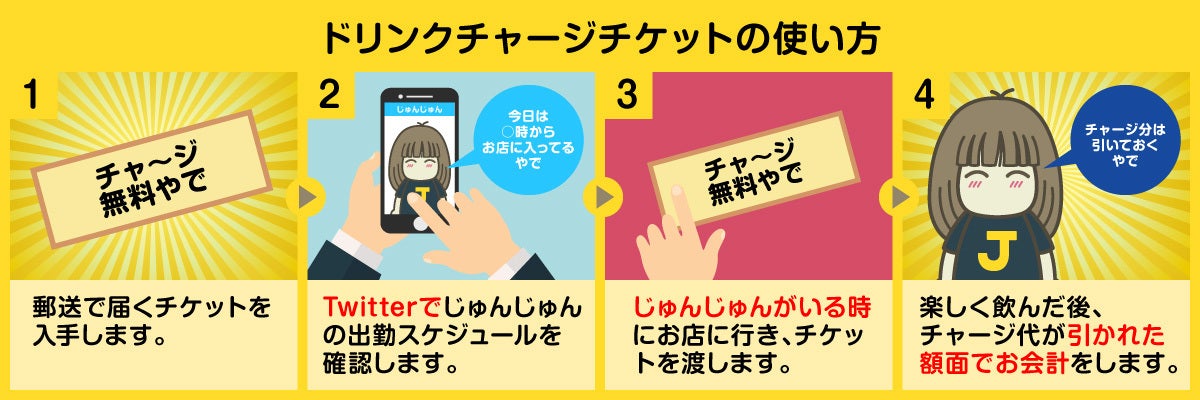 ・全てのコースについてくるドリンクチャージチケットは、じゅんじゅんがお店(シネストーク、火・木・金・土曜日)に入っている時に持ってくるとドリンクチャージ(ドリンク代とは別途にかかる料金)が1回無料になるものです。じゅんじゅんが店に入っていない時は使えません。ドリンクが1杯無料になるものではありません。(有効期限:2021年8月)