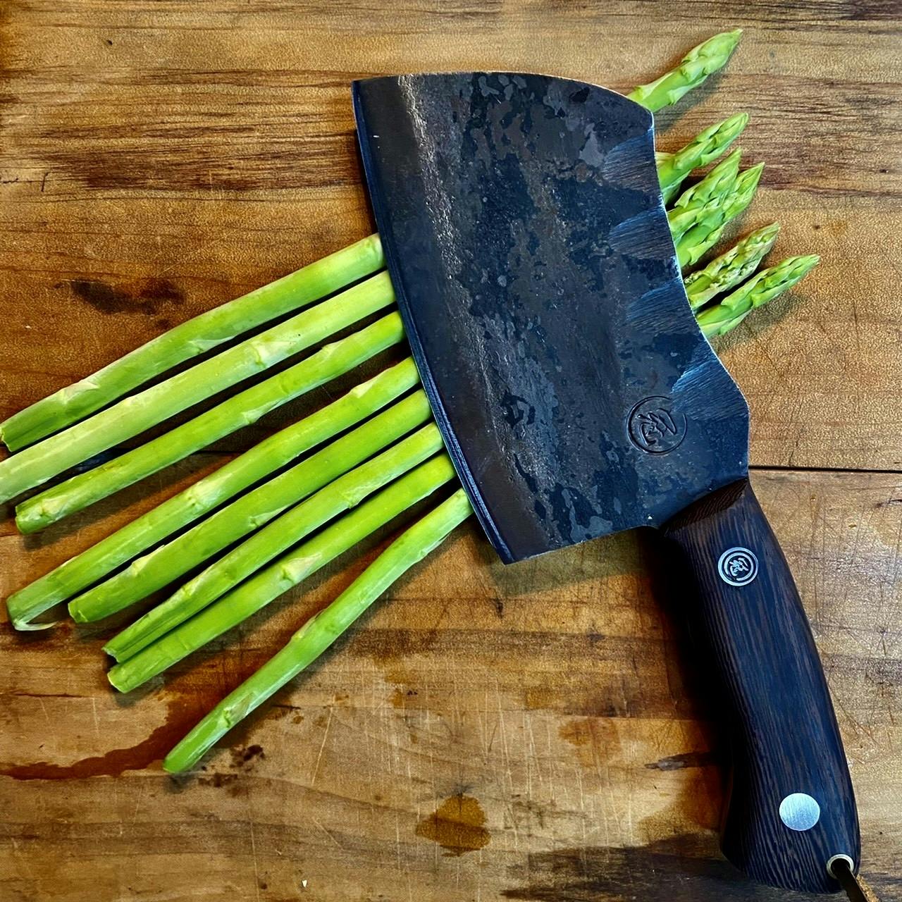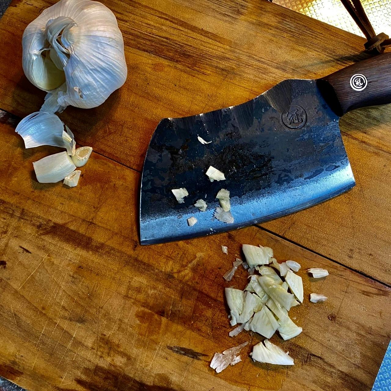 薄いナイフや包丁とは違い中華包丁の重厚感は、残しつつキャンプで使うには丁度いいサイズ感となりますので食材を潰す動作や、魚や肉の骨を簡単に断ち切ることができる 斧のような破壊力も備えております。