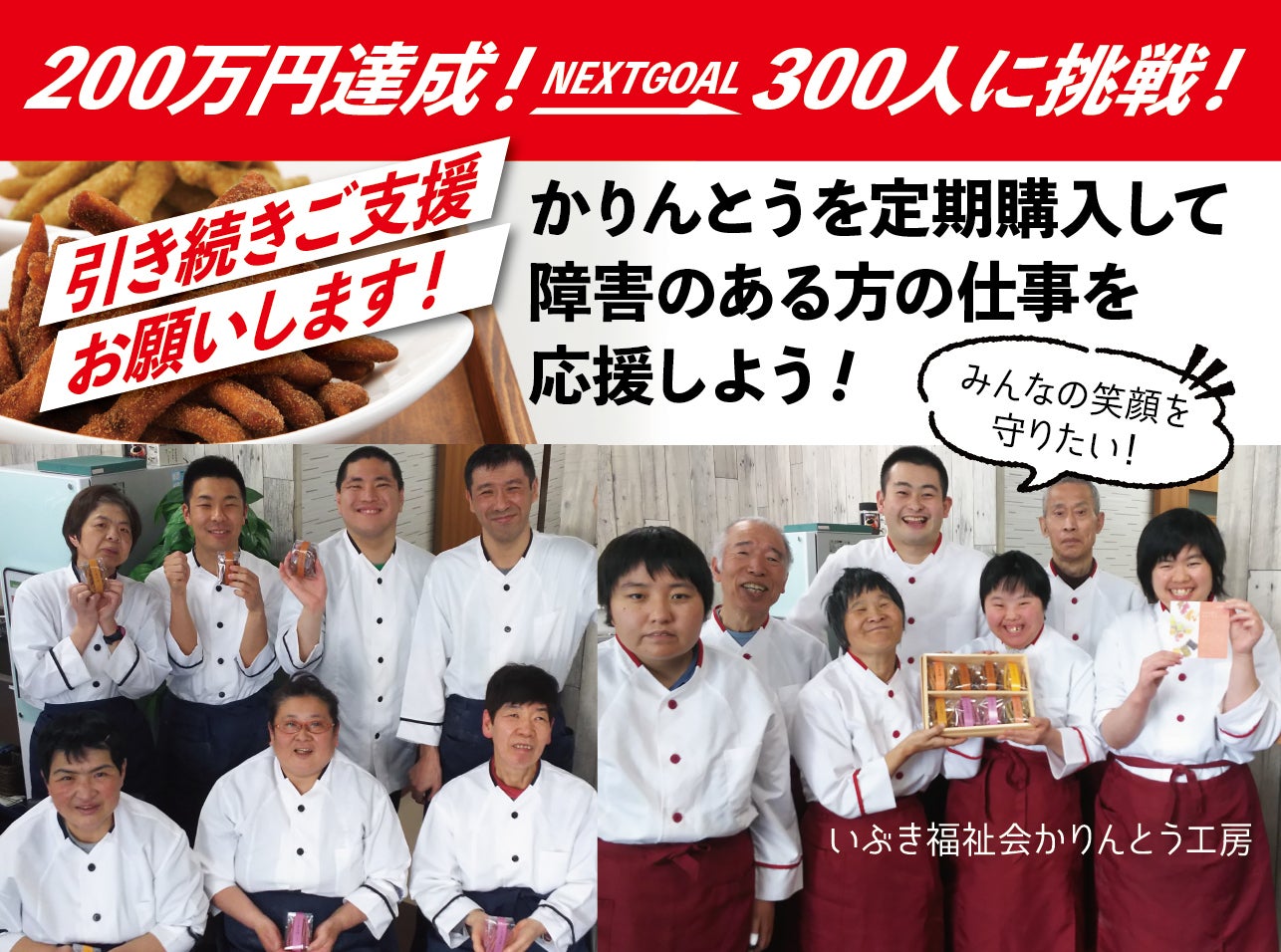 プロジェクトが終了しました。321人の方にご支援いただき、251万4280円、目標金額の125%の達成率、ネクストゴール300人も達成しました。この間本当にご支援いただきましてありがとうございます。ご支援いただいた金額はすべてかりんとうとお茶の商品代金と送料になります。そして、仲間たちの仕事をつくり、給料となります。誰もが困っているこの状況で私たちだけがご支援をいただくことには後ろめたさもありました。ですが、コロナ禍で苦しくてどうしようもない中で何とか皆様に助けていただきたいと声をあげさせていただきました。その声をこんなにもたくさんの方に拾っていただけたことがありがたかったです。そして、「がんばってね」や「支援させてもらったよ」と直接励ましを度々いただきました。その言葉と表情がいつも温かだったので、まるで「であえてよかったよ」といっていただいているようで、なんだかとてもうれしかったです。すべての方にご支援一回ごとにそんな声をかけていただいている気がして本当にうれしく、励まされる毎日でした。コロナ禍はまだまだ続きそうですが、支えられていることを感じながら前を向いて過ごしていけそうです。いただきましたご縁を大切にしたいと思います。準備が整いましたら、順次返礼品をお送りいたします。私たちが丹精込めて作ったかりんとうとお茶が、皆様に少しでも笑顔の時間をお届けできることを願っています。今しばらく楽しみにお待ちいただければ幸いです。ありがとうございます。返礼品まごころをこめてお届けします楽しみに待っていてください。