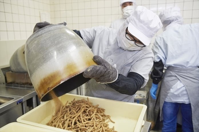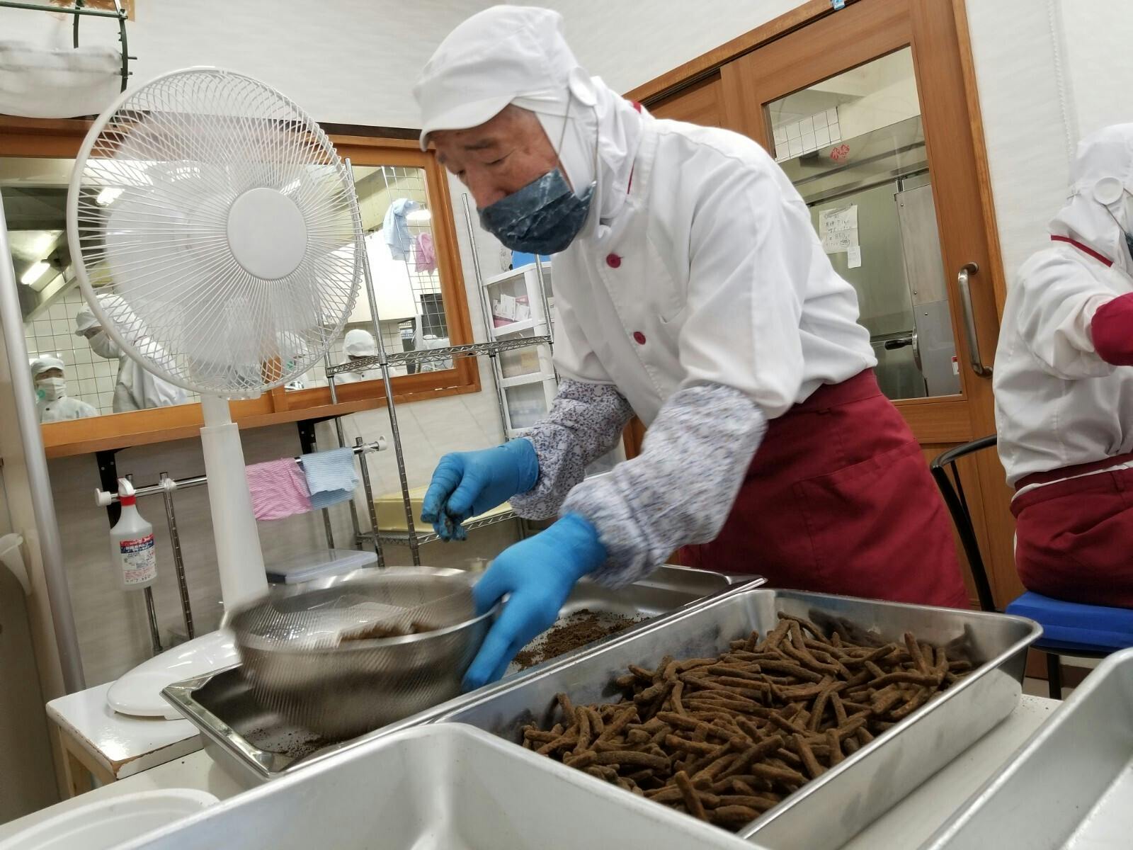 味つけが終わり、バットにかりんとうを開けているところ