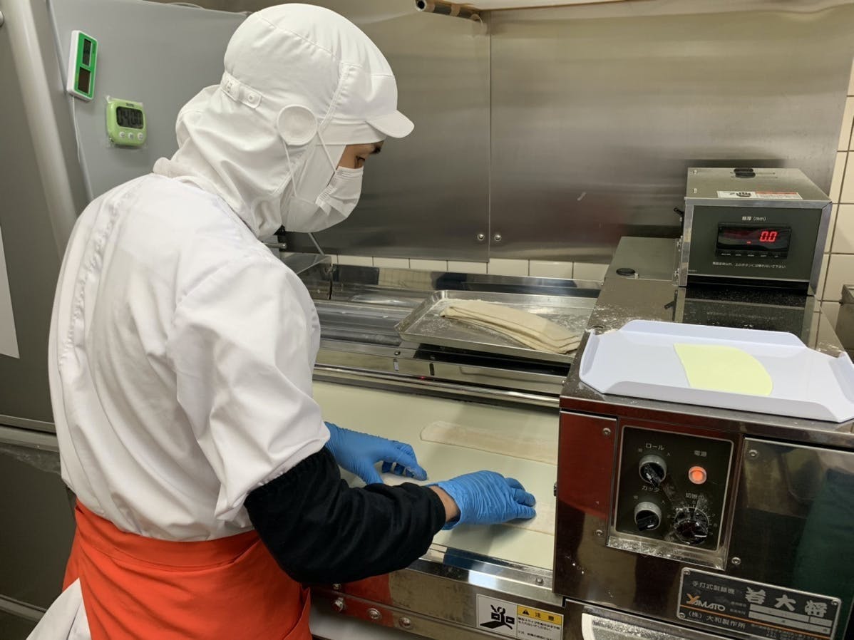 岐阜県産の小麦と岐阜県の平飼い有精卵をこねて、寝かした後にカットします。