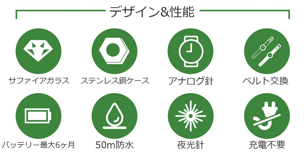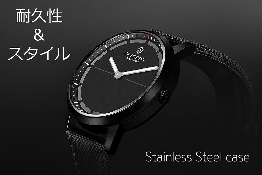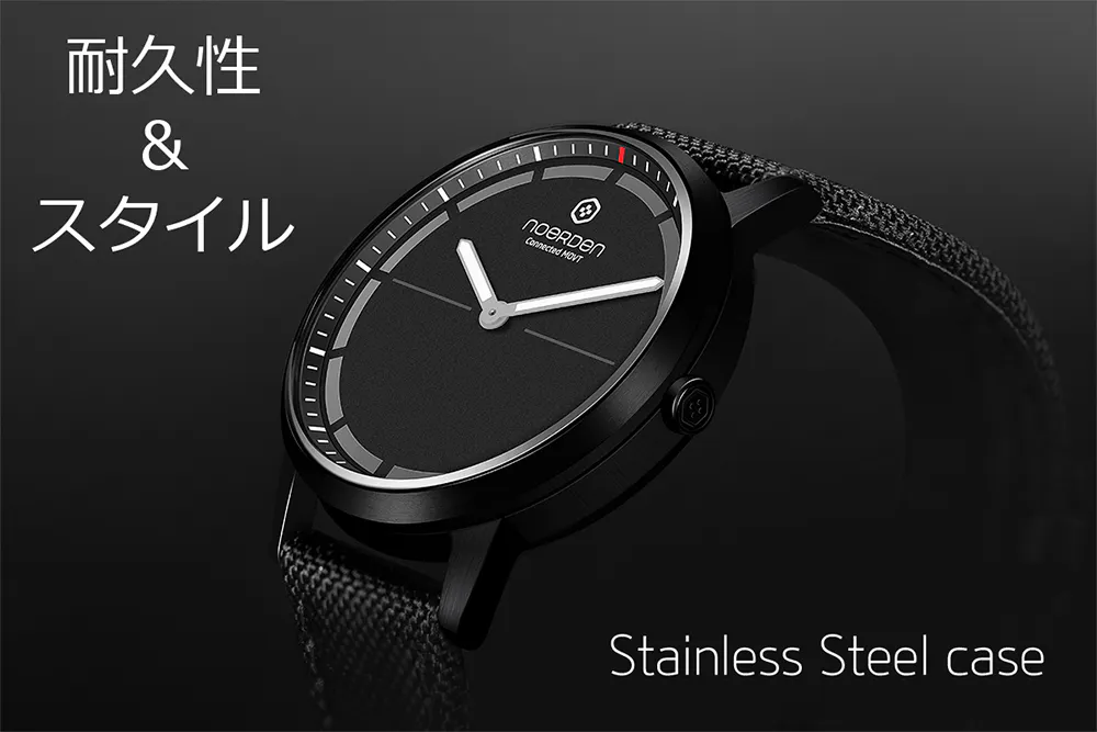 時計のケースはステレンス鋼を使用しておりスマートさを魅せると同時に内部を保護します。また、サファイアガラスがキズや衝撃から内部を守るため安心してお使いいただけます。