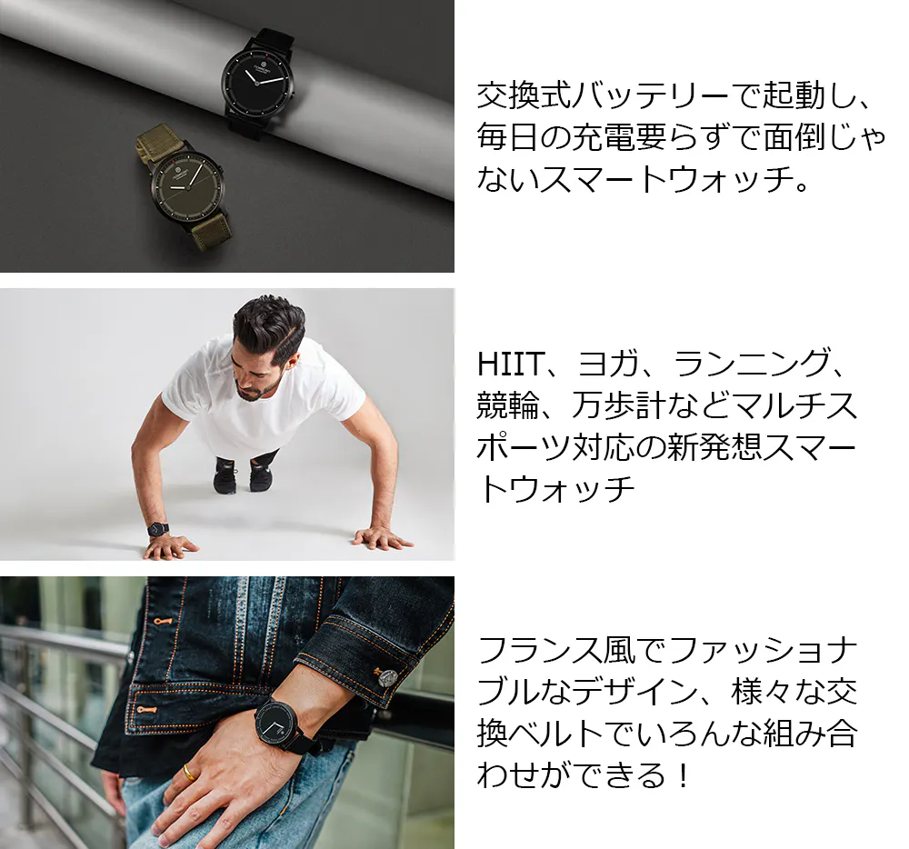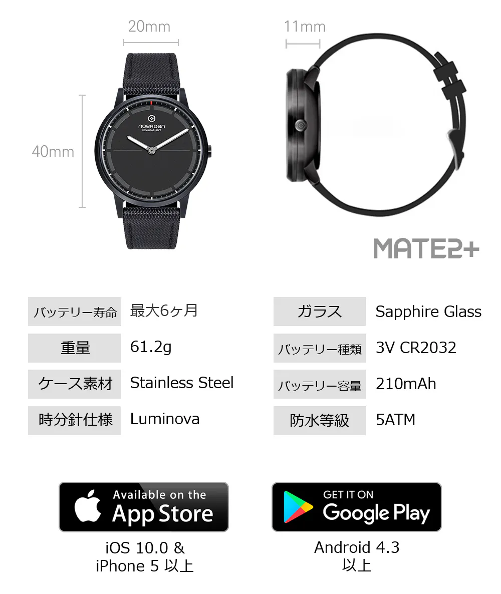MATE2+スマートウォッチは面倒な充電が不要な時計です。コイン型電池を使用して充電の手間を省き、出費を抑える開発を進めました。腕時計の電池は市場で低価格で手に入り、ユーザーが簡単にスピーディーに交換することが出来ます。ファッションの国フランスの感覚を取り入れたデザイン開発にも力を入れました。NOERDENチームは腕時計を着けた時にクラシックさとおしゃれさはもちろん、スマートさも魅せることができるという点にこだわりました。