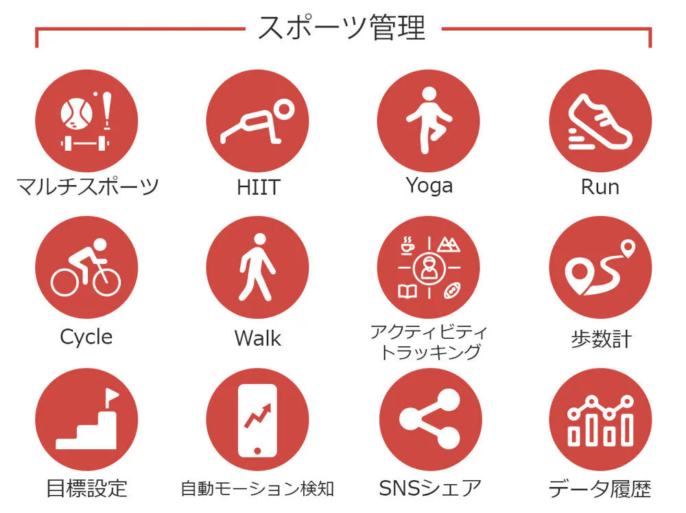 マルチスポーツ機能は5つのスポーツ機能を選択しプログラムや種類別にトレーニングを選び、トレーニングタイム・休憩タイム・セット回数をカスタマイズでき、運動の活動を分析してトレーニングすることができます。