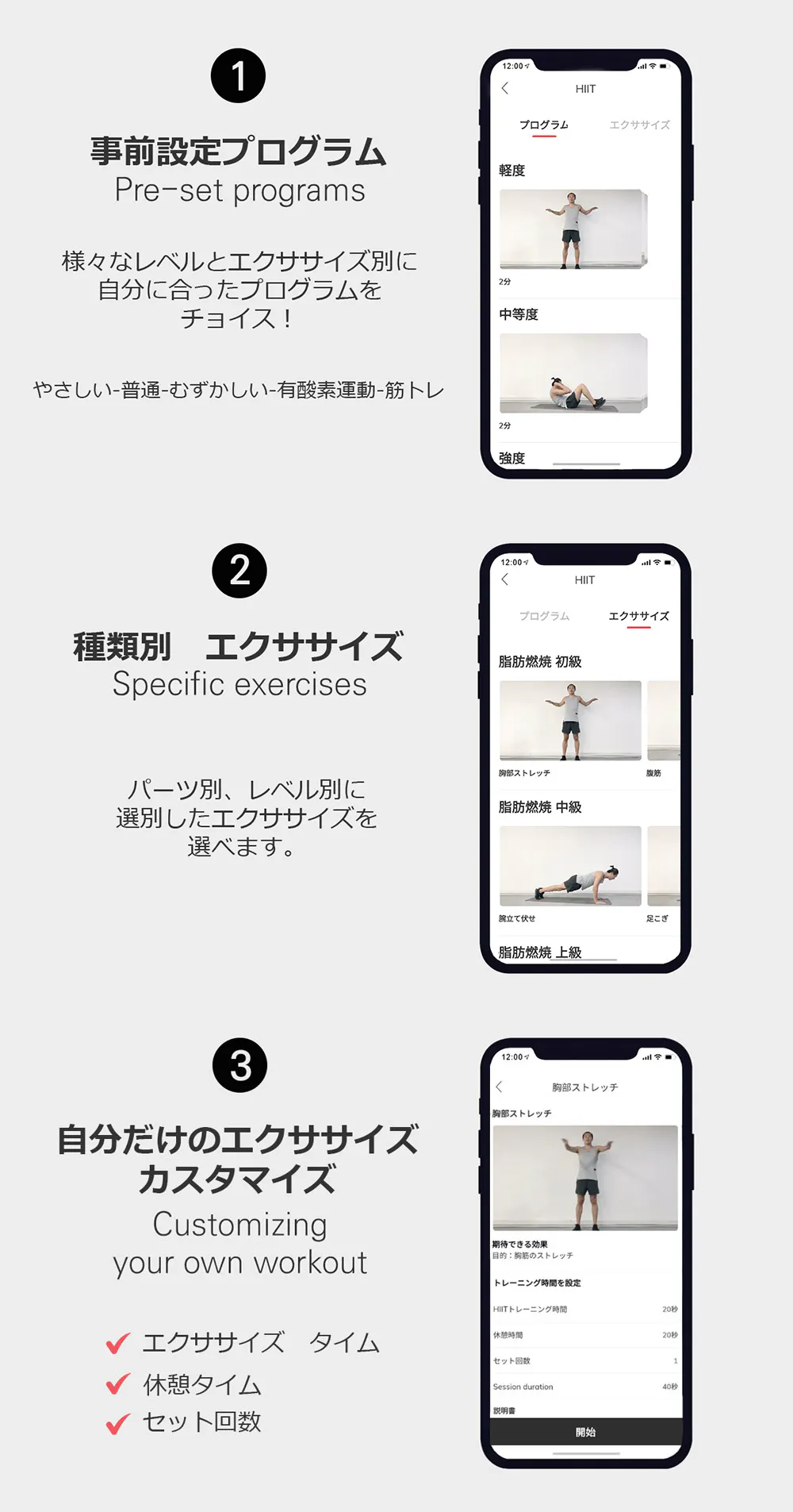 NOERDENアプリのHIIT(高強度運動)では、部分別のトレーニングを選択できます。バイブ通知でもスマートウォッチがHIITをサポートしてくれるので手軽にホームトレーニングをすることができます。
