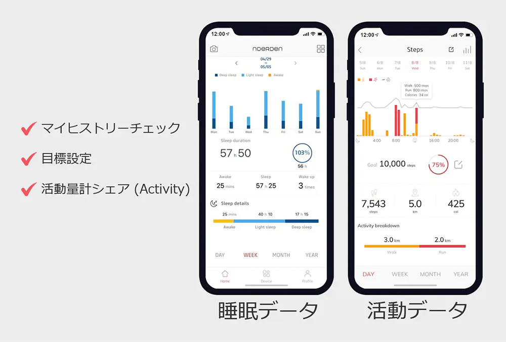 基本的な睡眠/活動データのヒストリー管理、目標設定はもちろん、SNSを通して統計データを自由にシェアできます。また、それだけではなくAppleのヘルスケアとの連動・省電力モード・活動量計機能を通してよりシステム化された管理をすることができます。