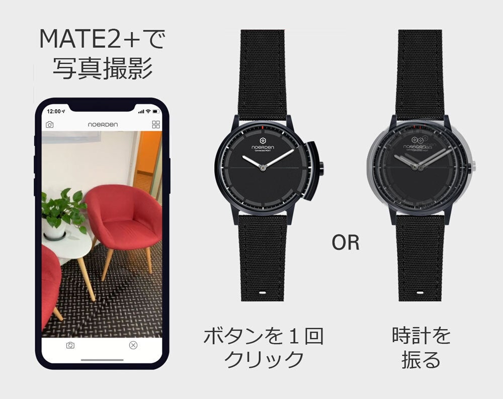 MATE2+があれば手を触れずに写真撮影ができます。時計を振ったり、ボタンを押すことで簡単に自撮りや団体写真を撮ることができます。