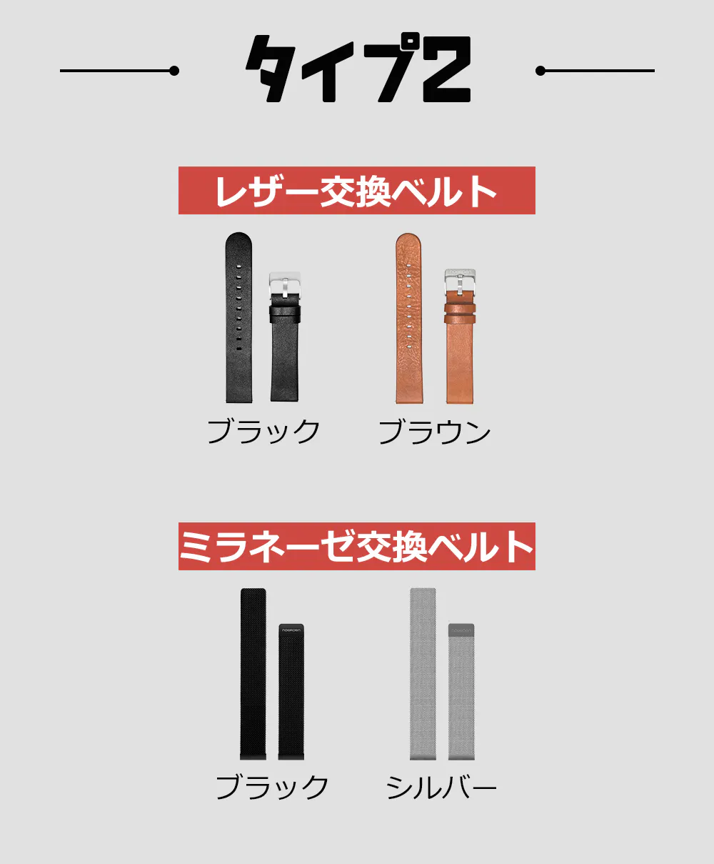 MATE2+の腕時計は20mmのベルトを交換することできます。自分だけの個性を演出してみてください。