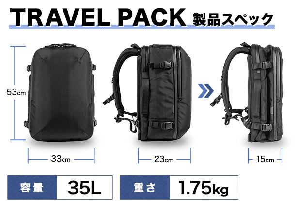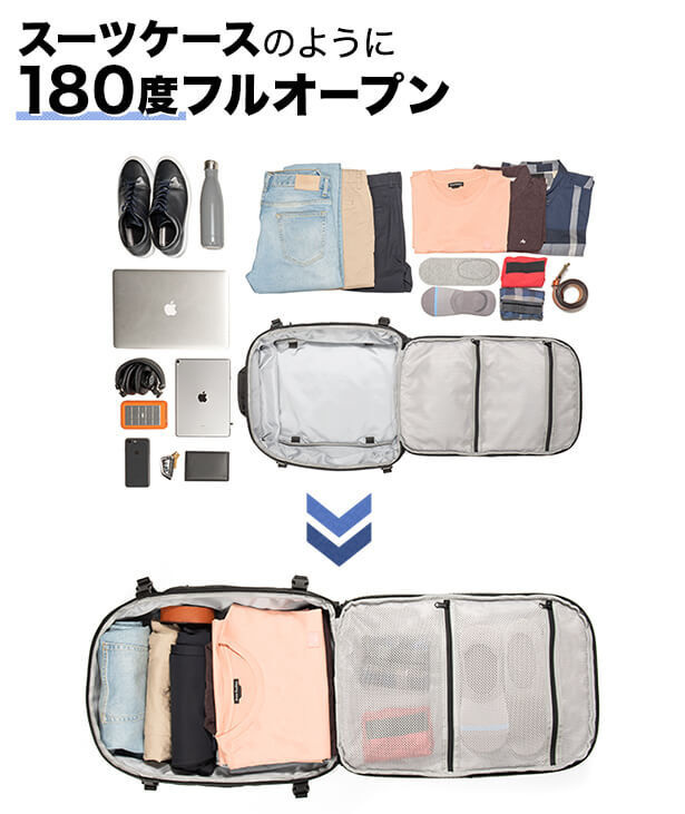 TRMNLのトラベルパックには、収納力抜群のボディとデザイナーがこだわり抜いた様々な機能が搭載されています。