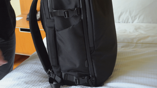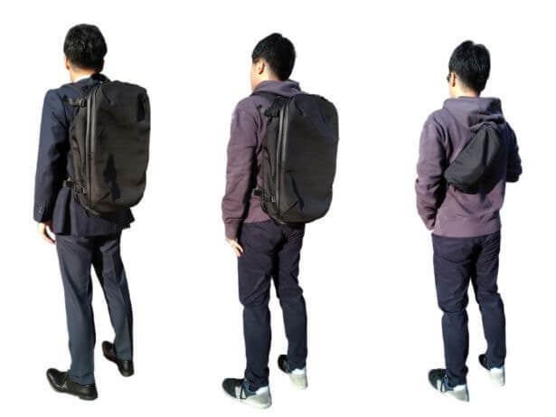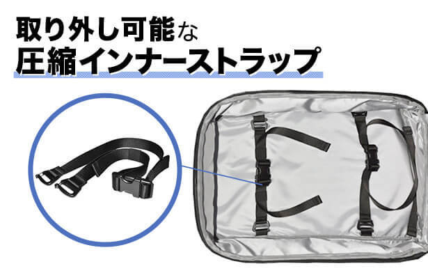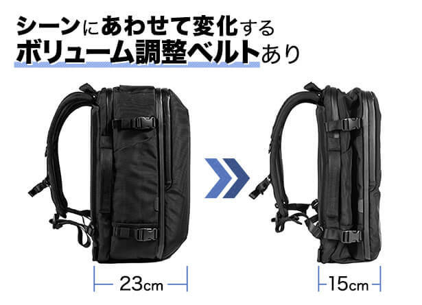計4個のサイドストラップで幅を調整して、よりスマートな見た目に変化させることができます。旅行時には、縮めて使えば1泊分、広げて使えば2~3泊には対応可能です。