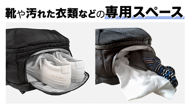 などの場合でも、靴の収納スペースがあるので便利です。使わない場合はナイロンを折りたたんでおけば、内部空間を効率よく利用することができます。