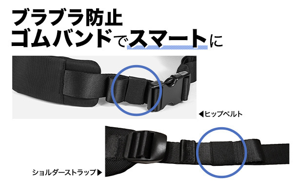 チェストストラップ、ショルダーストラップ、ヒップベルトには、ゴムバンドが付属。紐の余った部分をまとめることで、スマートな見た目になります。