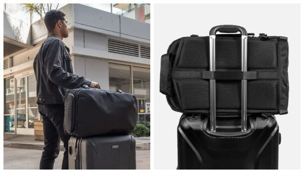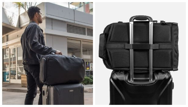 キャリーバッグを使用する場合でも、背面中央のベルトで簡単にハンドルに固定できます。