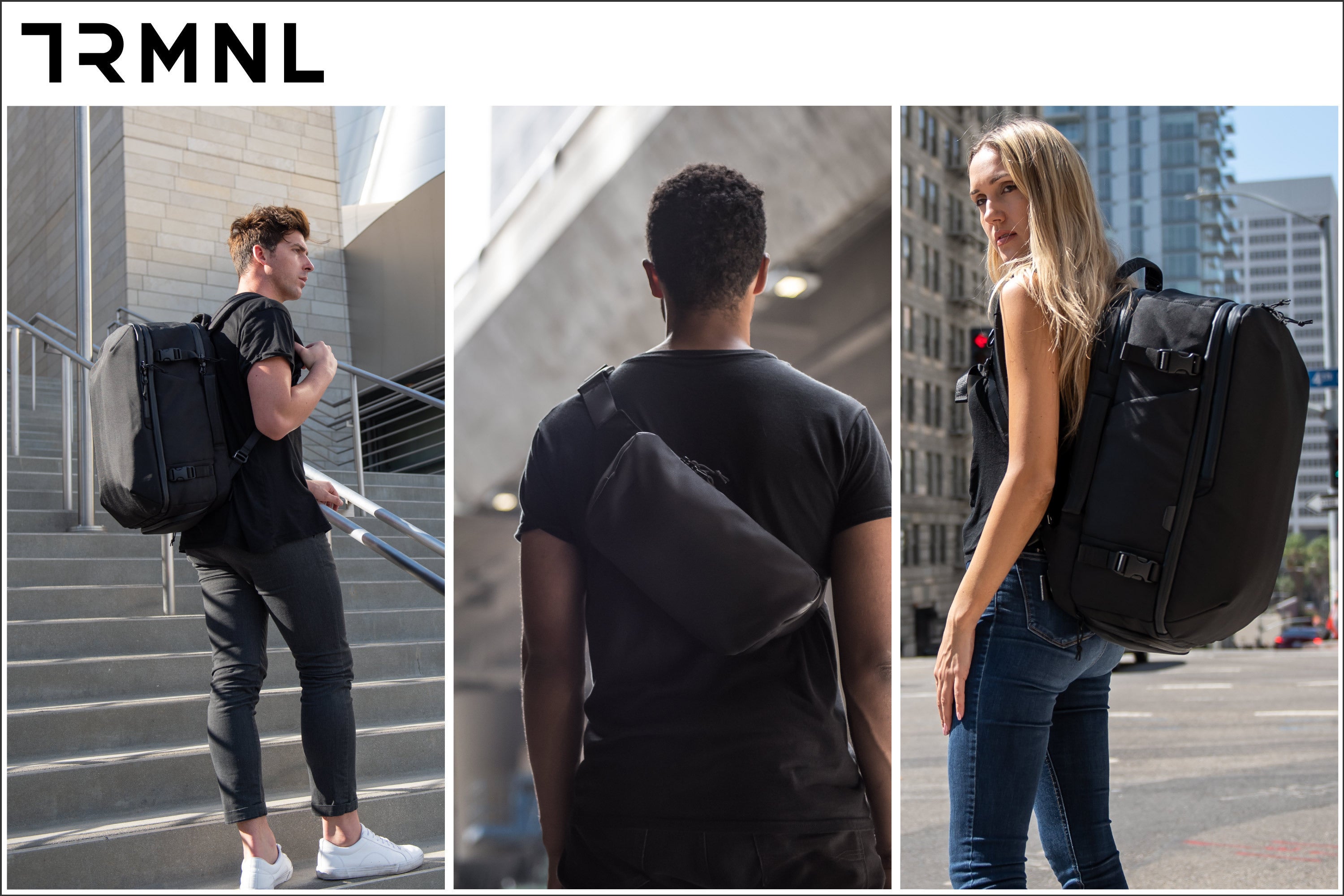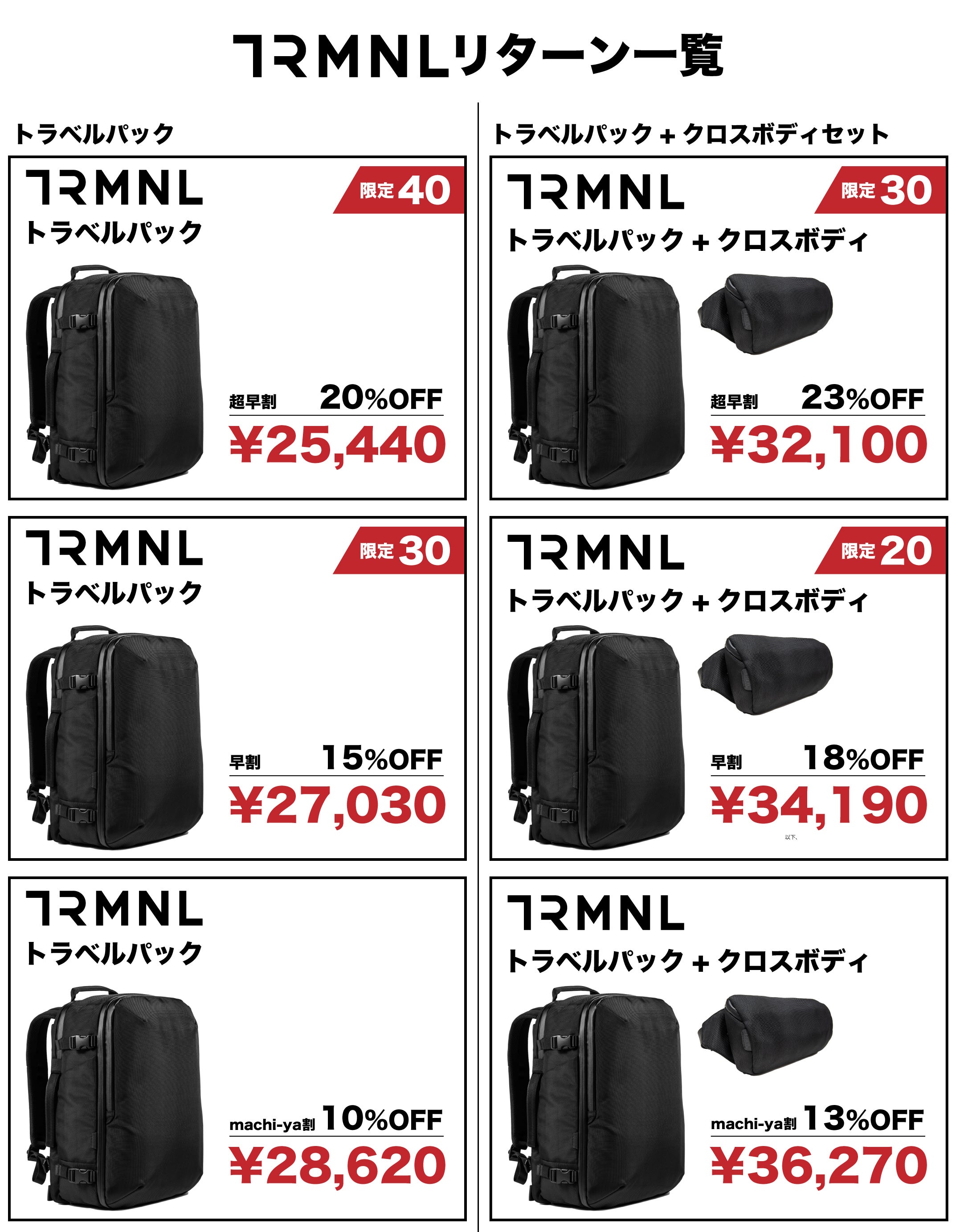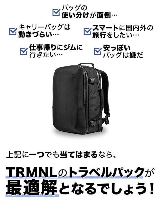 「TRMNL(ターミナル)」は、空港、バス、電車のターミナルなど、旅行における重要な場所という意味合いがあります。 私たちのミッションは、現代的ビジネスマン、通勤者、旅行者などのあらゆる移動先でのニーズを満たす、耐久性があり、機能的で高品質なアイテムを生み出すことです。