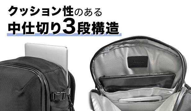中身は充実の3段構造となっているので、他にタブレット、A4・B4サイズの書類などをスッキリ整理できます。