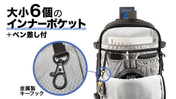 名刺入れ・手帳などの日々の必需品から、タブレット・イヤホン・モバイルバッテリー・充電器などのガジェット類を、大小6つのポケットで効率よく整理できます。