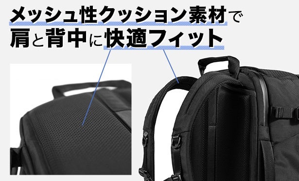 通気性のあるメッシュ素材のショルダーストラップ&バックパネルです。