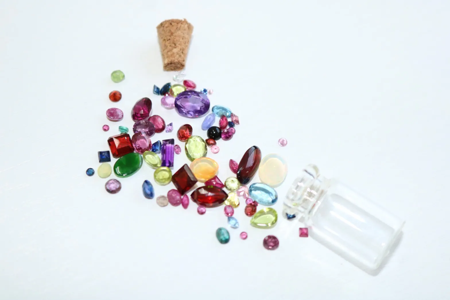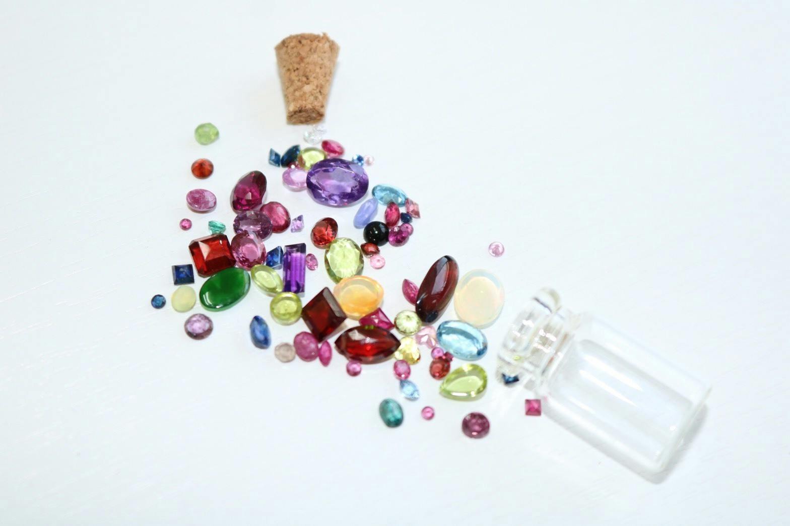 メッセージカードと宝石(エメラルド・ルビー・サファイア)アクアマリン、ブルートパーズ、ガーネット、アメジスト、などその他小さなルースを小さな瓶に半分詰めてお届けします。