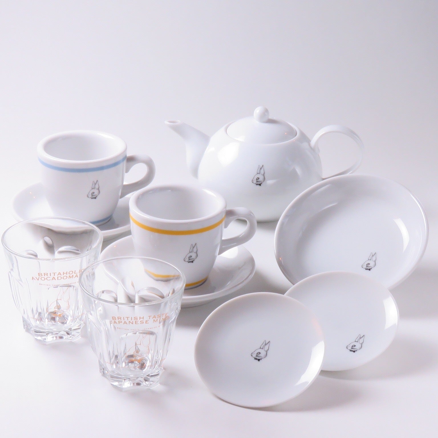 ★全ウサギオリジナルグッズご提供(コーヒーカップyellow/light blue 2セット、ビストログラス、お皿、ティーポット、Tシャツ、缶バッジ)
