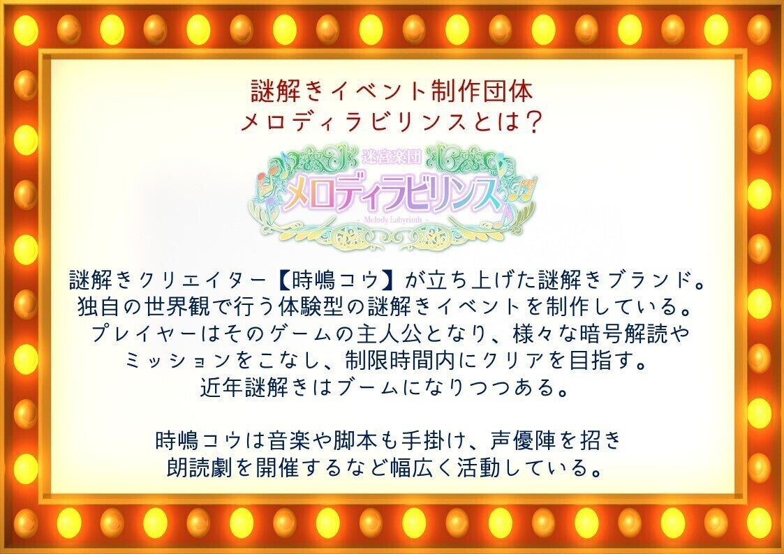 私は『楽団七芒星』という個人の事業を持ち、その中でも謎解き制作団体メロディラビリンスというブランドを立ち上げております。