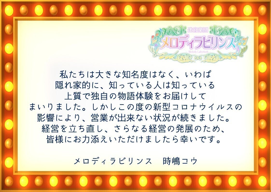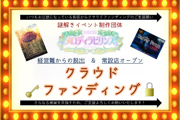 そんな中、謎解き、体験型イベントの運営はどうしてもお客様がいらっしゃらなければ成り立ちません。今までご来場されたすべてのお客様に感謝するとともに、よりいっそう面白い物語体験を提供すべく、このたびメロディラビリンスでは【常設店舗をオープンする】ということを目標に掲げ、クラウドファンディングを実施させていただきます。