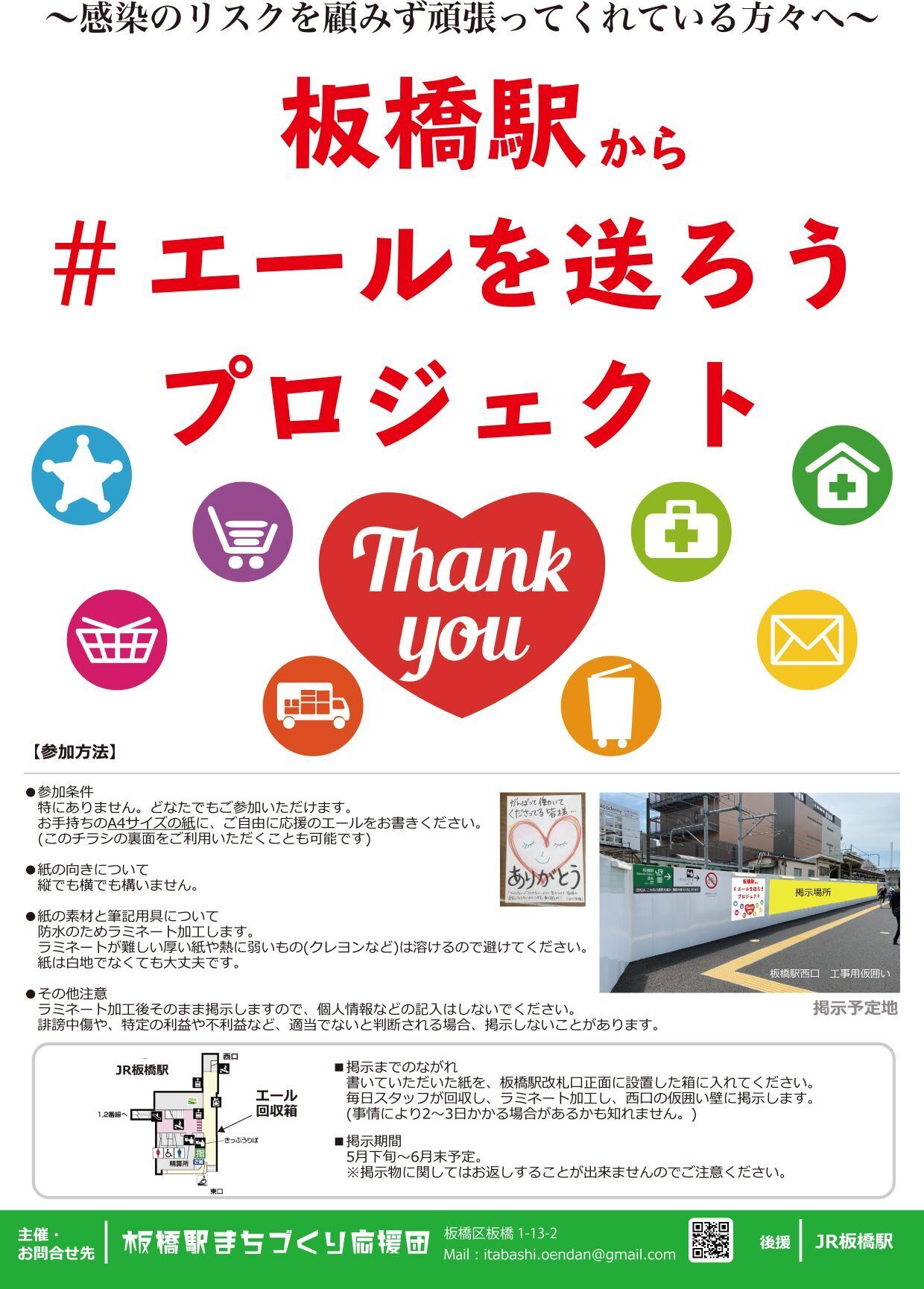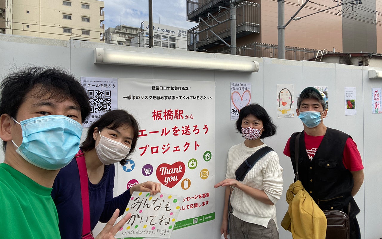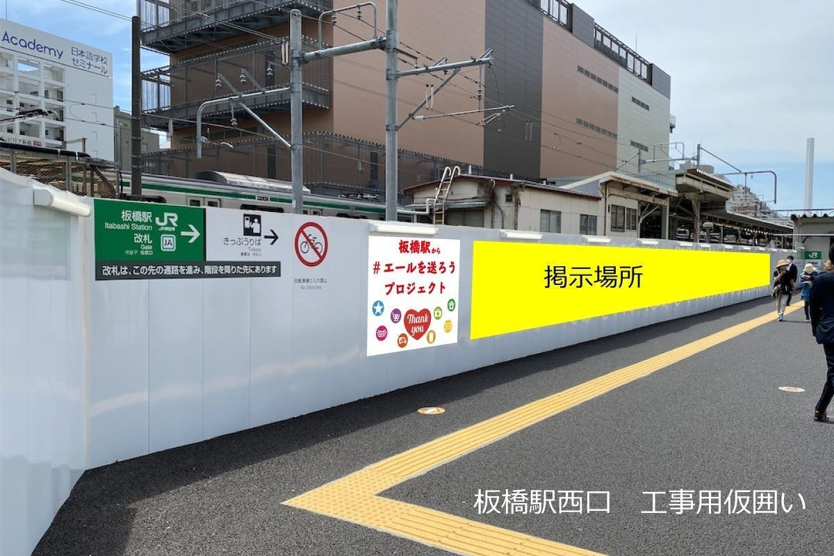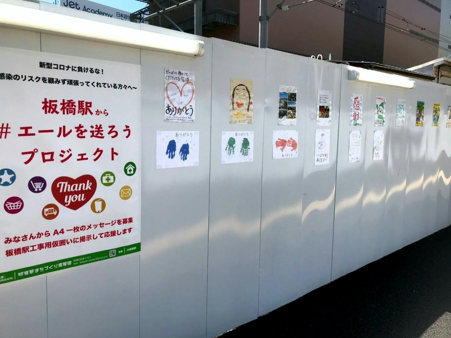 そう思い立ち、皆さんからA4の応援メッセージを募集し、JR板橋駅西口の工事仮囲いに掲示するイベントを企画しました。