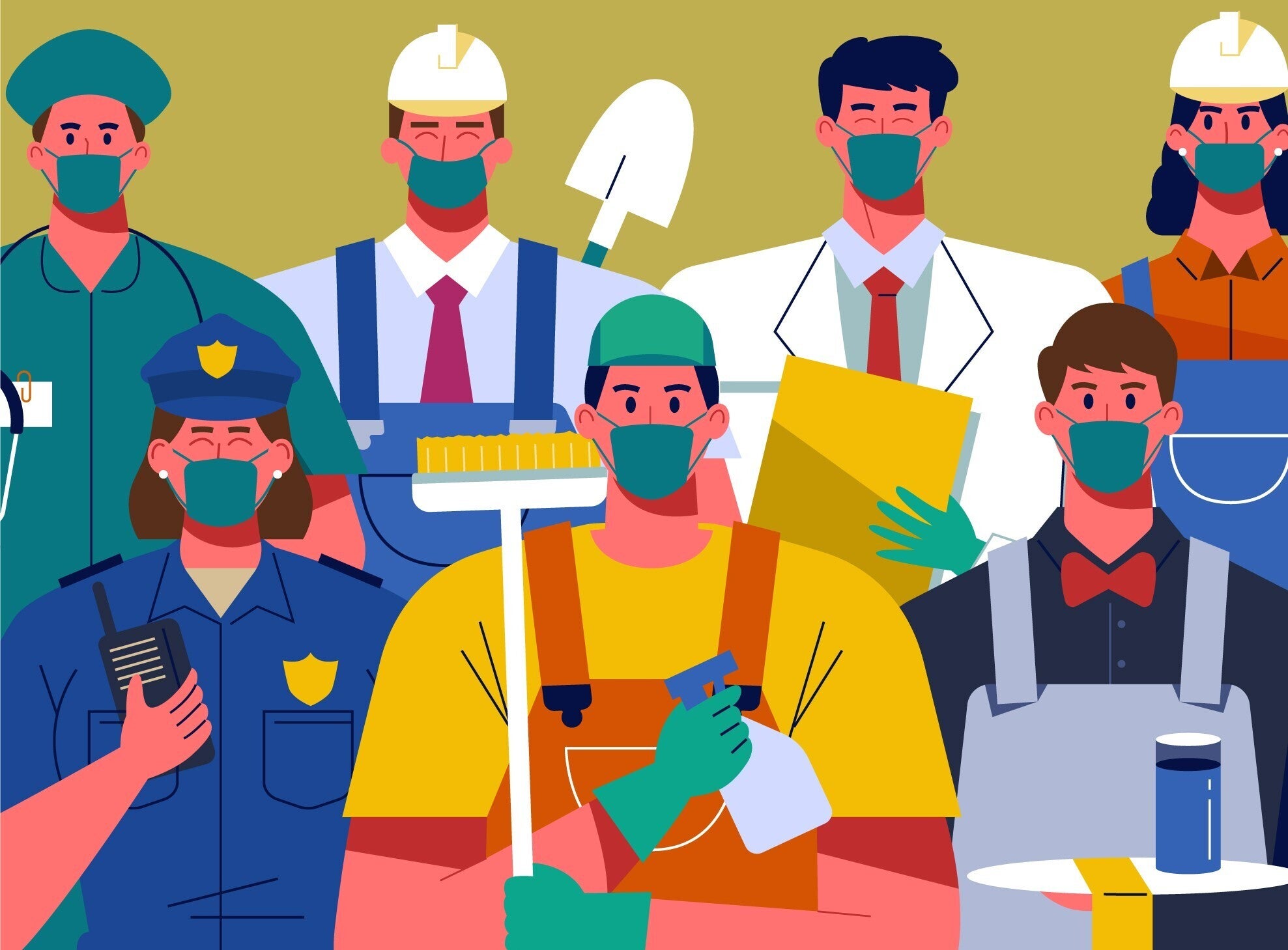 医療従事者、警察、行政、スーパーなどの商店、宅配業者、メディア、ゴミ収集の方々などなど。